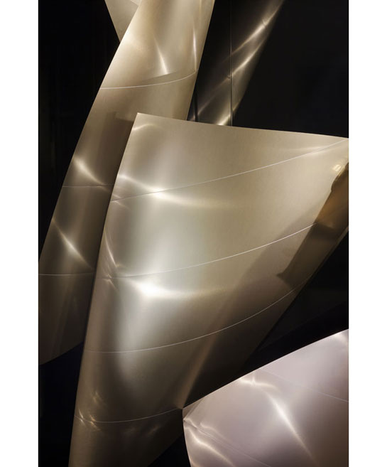Fuertemente inspirado por las elegantes goletas del pasado, las esculturas que el arquitecto utilizó son estructuras de madera cubiertas de metal. “Son como velas desplegadas por el viento. Las llamamos Alas de Viento” explica Gehry.