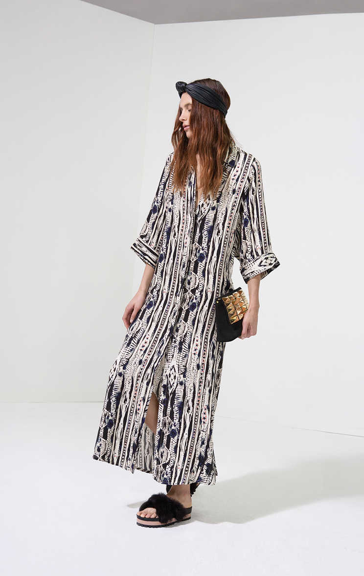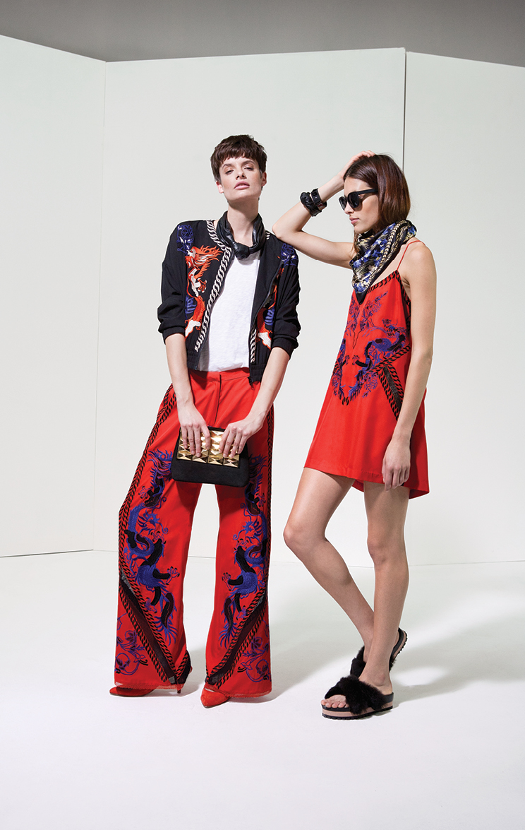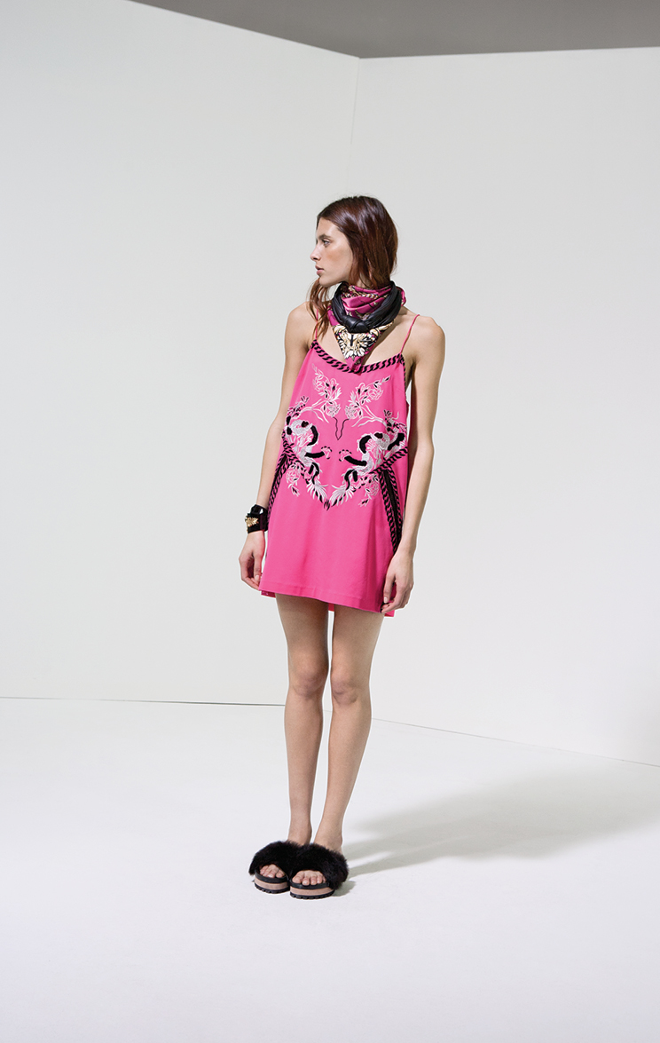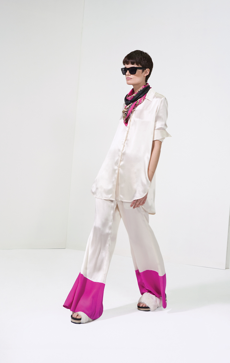 Por la noche la colección ruge con bordados en vestidos de seda y abrigos ligeros, estampas intrincadas en pañuelos y monoprendas y encaje y transparencias floreadas en faldas soñadas. Perdiéndole el miedo al total look, la propuesta incluye pantalones que se combinan con camisas estampadas en estampas violentas y hasta camuflados militares.