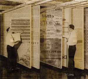 Su obra tiene un tratamiento especial y esto genera un resultado distinto: el tratamiento con barniz, transforma las hojas en algo bidimensional, y parecen varias capas superpuestas. El resultado de este proceso creativo son unos collages que se construyen por medio de la superposición y la yuxtaposición de distintas hojas de diarios. El tamaño el color son siempre diferentes y también el espesor de cada obra.