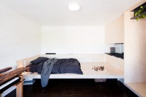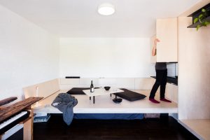 El nuevo espacio habitable ocupa una gran parte de los metros cuadrados, bloqueado desde la puerta de entrada por un pasillo de almacenamiento de madera. La misma madera contrachapada ligera continúa en la sala de estar con una unidad flotante multipropósito que va desde una gran área de asientos para ocho personas hasta una cama para dos personas en cuestión de minutos. El almacenamiento incorporado lo rodea y mantiene las cosas ocultas cuando no está en uso.