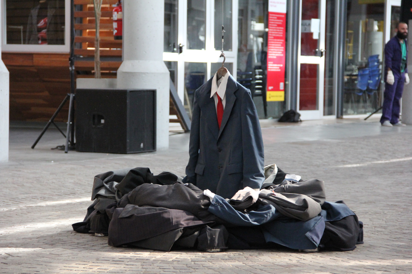 Del 7 de febrero y hasta el 11 de abril, una torre interactiva de oficinistas va a ser la protagonista de la calle principal del CMD. Se trata de la instalación del artista, curador, educador y arquitecto argentino Gaspar Libedisnky, quien recicló 36 trajes del Ejército de Salvación y los convirtió en un tótem de nueve metros de altura que puede ser izado o colapsar según decida el público. El hombre como un pilar, un módulo de construcción, fuerte y organizado, que se desvanece pasando a ser un montón de trajes aplastados. Diagrama de fuerzas y jerarquías que gracias al uso de una simple polea invierten sus roles.