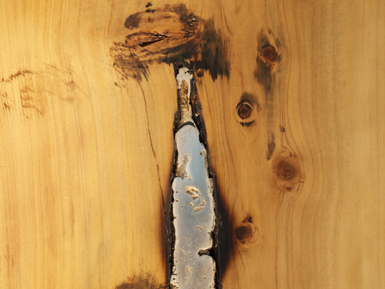 A la hora de unir los dos materiales, el calor del metal genera que el tronco se chamusque y que entre las dos piezas quede una línea de carbón que actúa como una unión entre dos mundos.