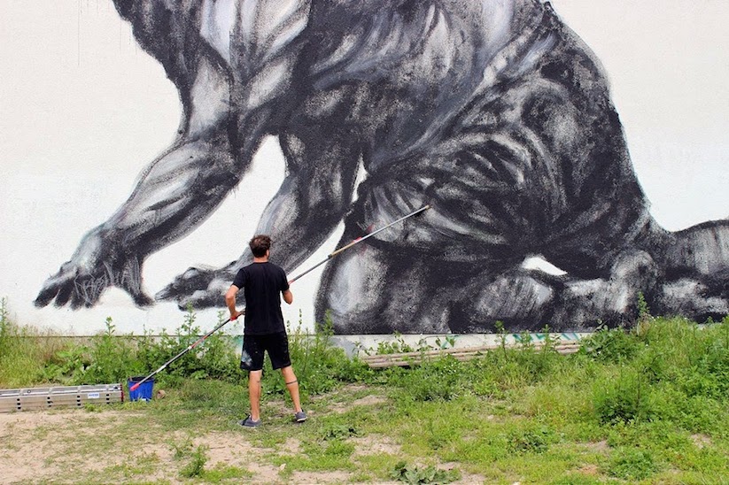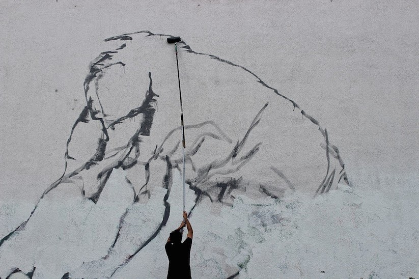 Este mural fue hecho exclusivamente para la Galería y solamente uso una brocha y pintura negra.