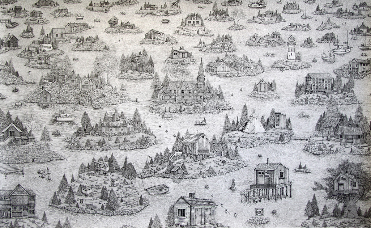 Sus trabajos a pluma y tinta contienen aldeas de densas casas de árboles retorcidas dentro de bosques y cabañas de troncos salpicadas en islas privadas, cada una de las cuales parece estar aislada de la civilización moderna.