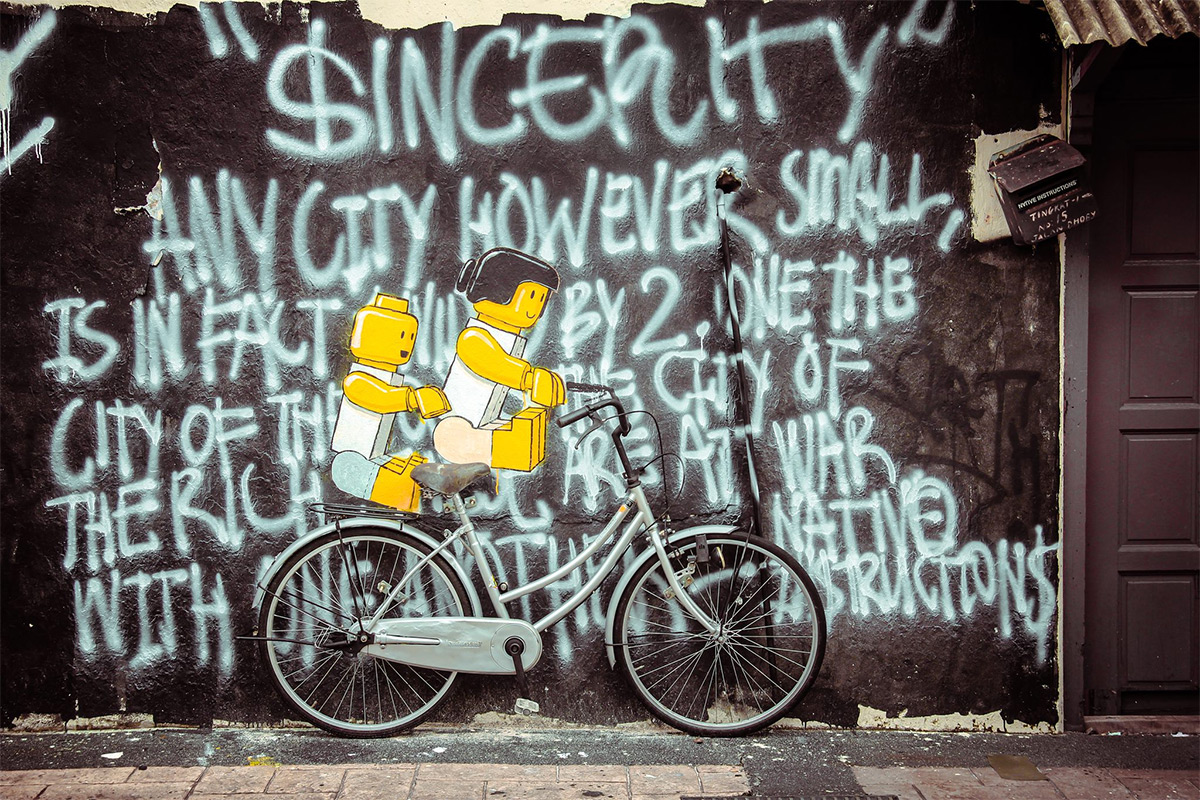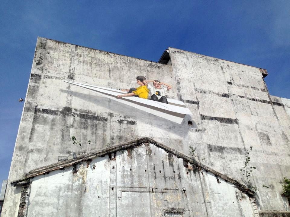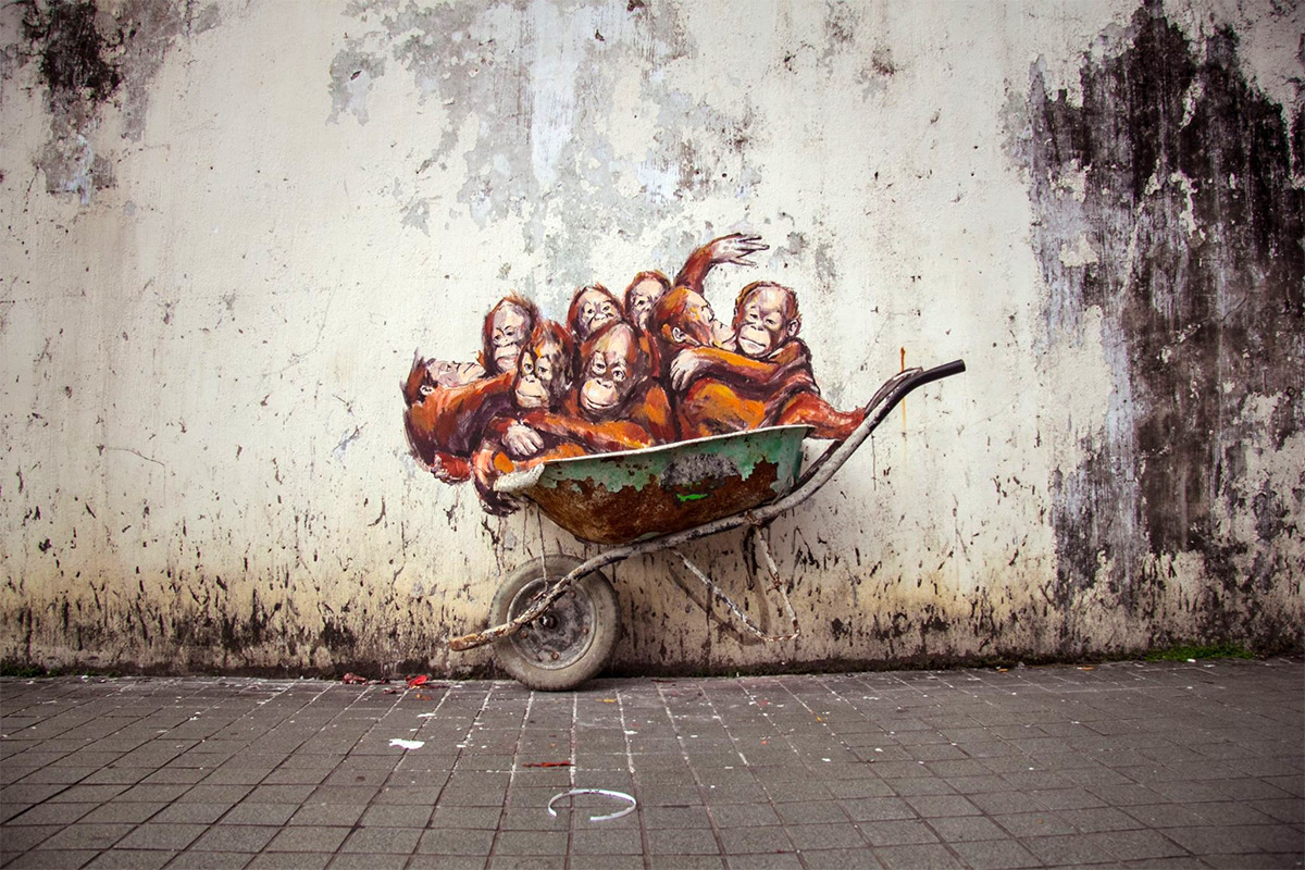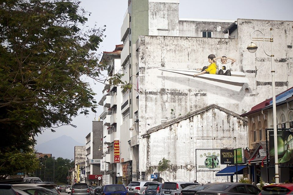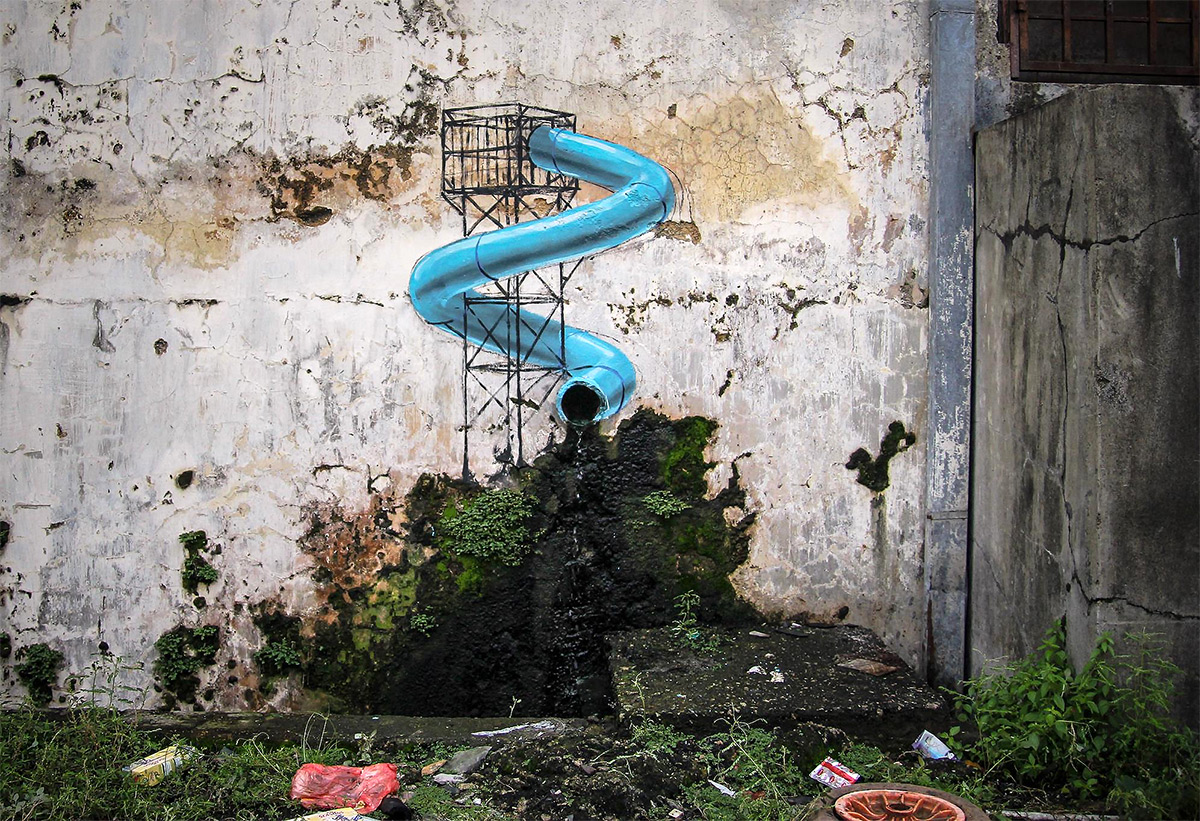 El artista Ernest Zacharevic estuvo en los últimos meses plagando las calles de Italia y Malasia. Las temáticas no sólo tocan el estilo de vida de los locales, sino que utiliza los diferentes elementos que rodean las paredes como recursos para interactuar con sus obras.