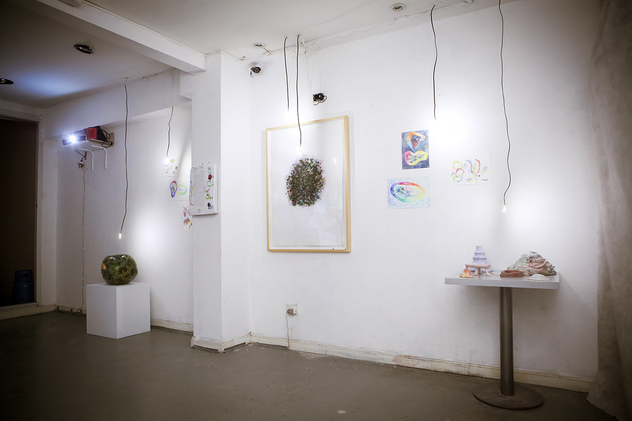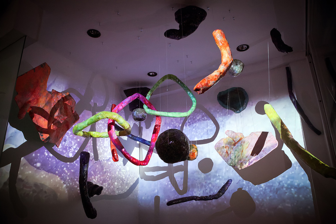 Las artistas se proponen construir un universo irreal, donde objetos escultóricos de formas orgánicas y con intenso cromatismo ocupan un espacio sin coordenadas descifrables pero al mismo tiempo ordenados y alineados, envueltos en una atmósfera galáctica sin límites claros. Este equilibrio astral se encuentra en constante movimiento y transformación. Suspensiones, rotaciones, atracciones. Un continuo de tiempo y espacio infinitos.