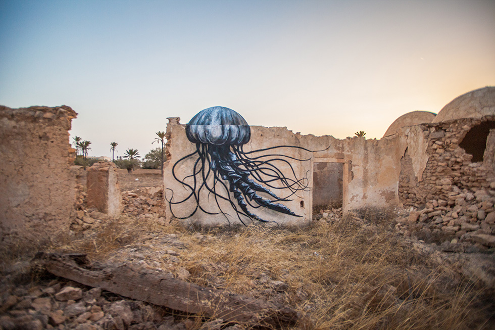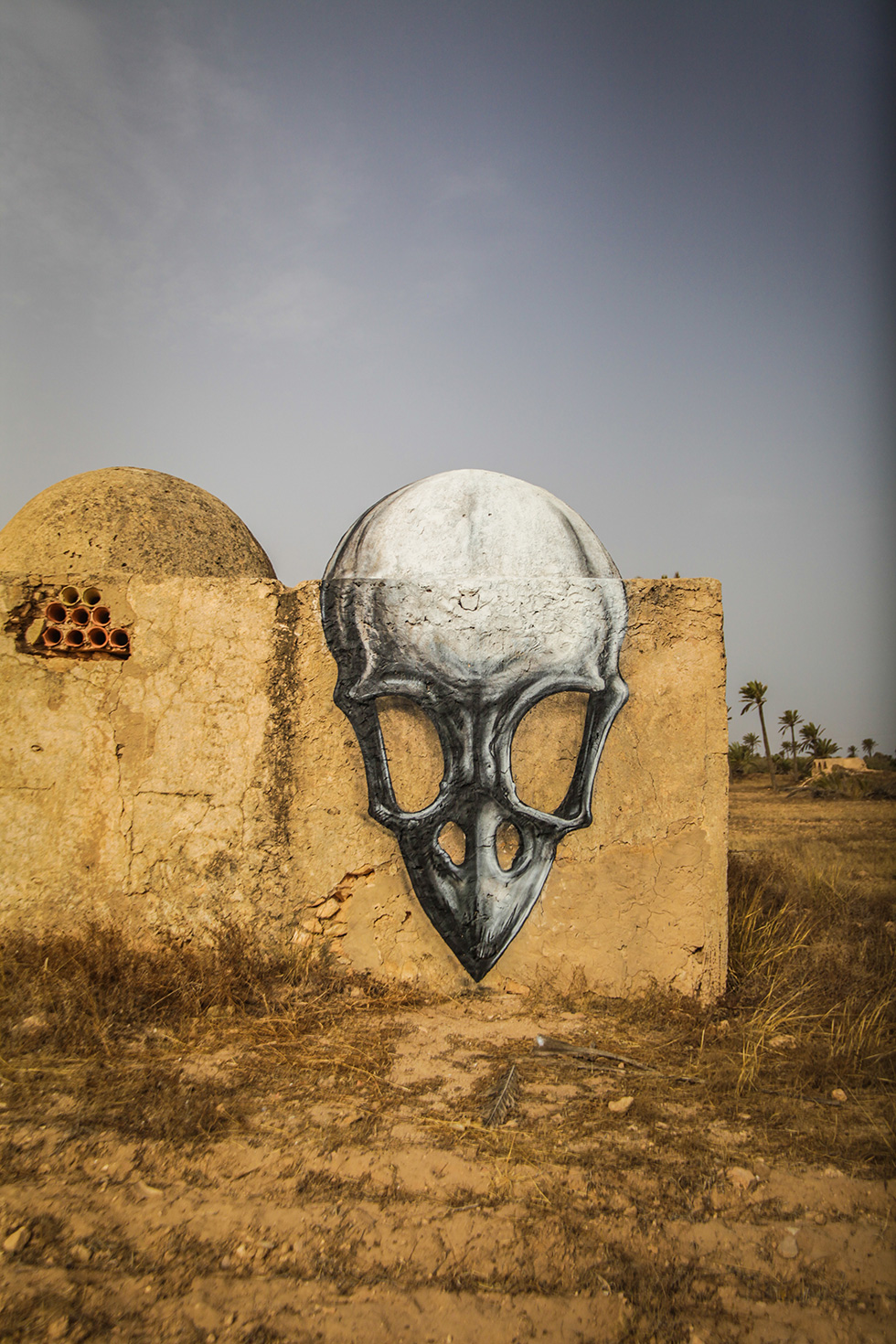 Aprovechando la arquitectura tan característica de Túnez, con esos domos que sirvieron de escenario para crear el planeta Tatooine en Star Wars, el artista belga ROA creó nuevos animales fantásticos en blanco y negro en el marco del Galerie Itinerrance’s Djerbahood, un museo al aire libre en el país africano.