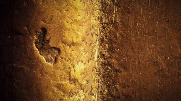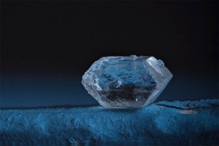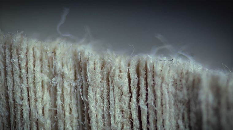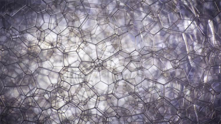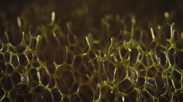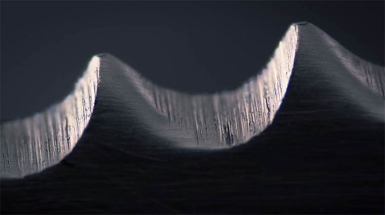 Así, un grano de azúcar se convierte en un cubo de hielo hexagonal, una esponja de cocina toma la textura de un alga marina, y el filo de un cuchillo serrado se asemeja a una formación montañosa.
