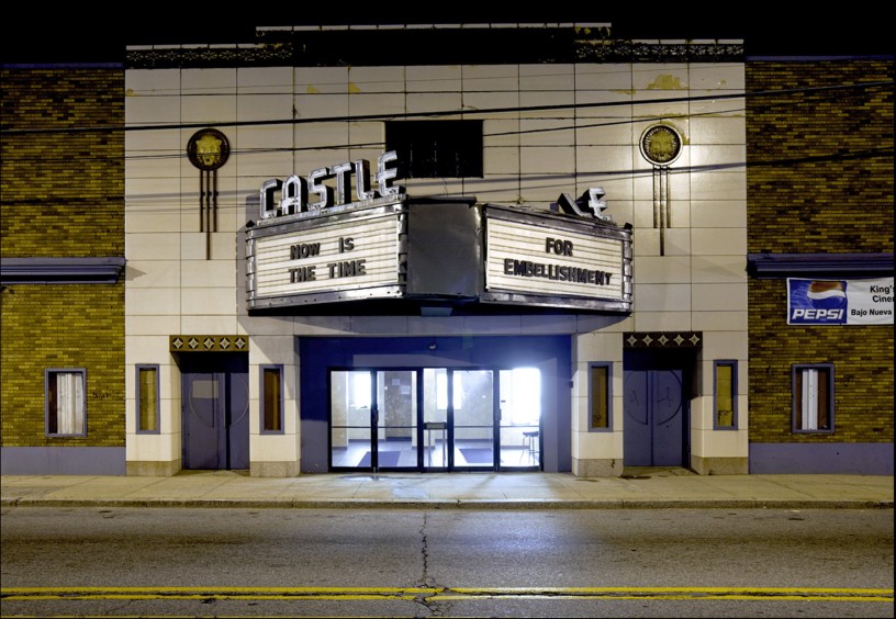 “Este proyecto utiliza la fotografía para documentar mis intervenciones de texto en signos de marquesina en carretera. El trabajo se centra en el efecto de los medios de comunicación y la tecnología en el deseo humano. Pongo frases en letreros de cines y moteles. Utilizo mis propias cartas de signos, los instalo y coloco frases, para luego abandonar la escena con palabras que dejan intacta la señal. Después hago mi fotografía de la muestra acabada. Yo uso una cámara de gran formato y hago uso de impresiones en color a gran escala, como un documento de la señal en su entorno. La fotografía se convierte en el único vestigio que queda del proyecto, ya que los signos inevitablemente desaparecen o se bajan.”