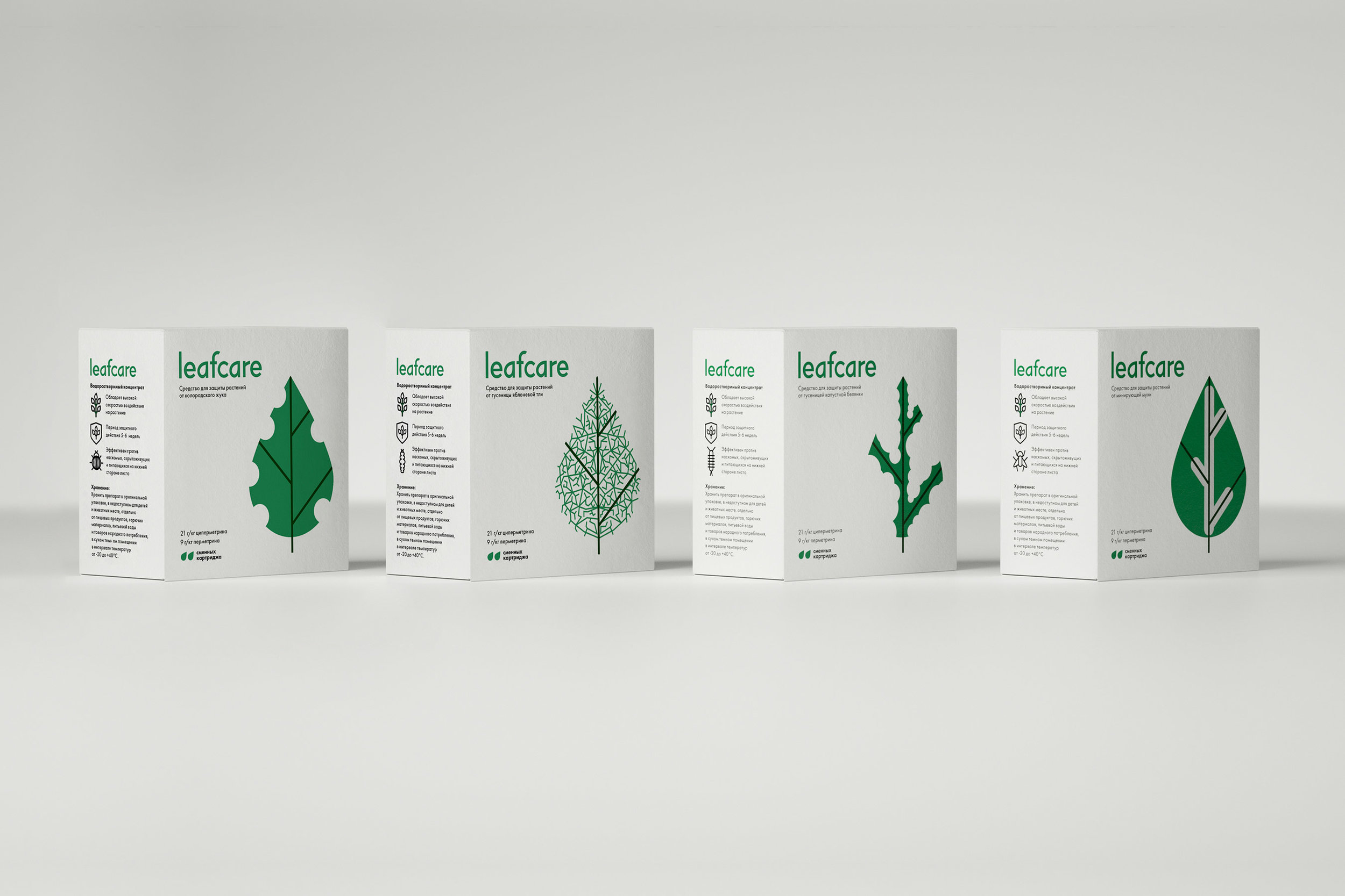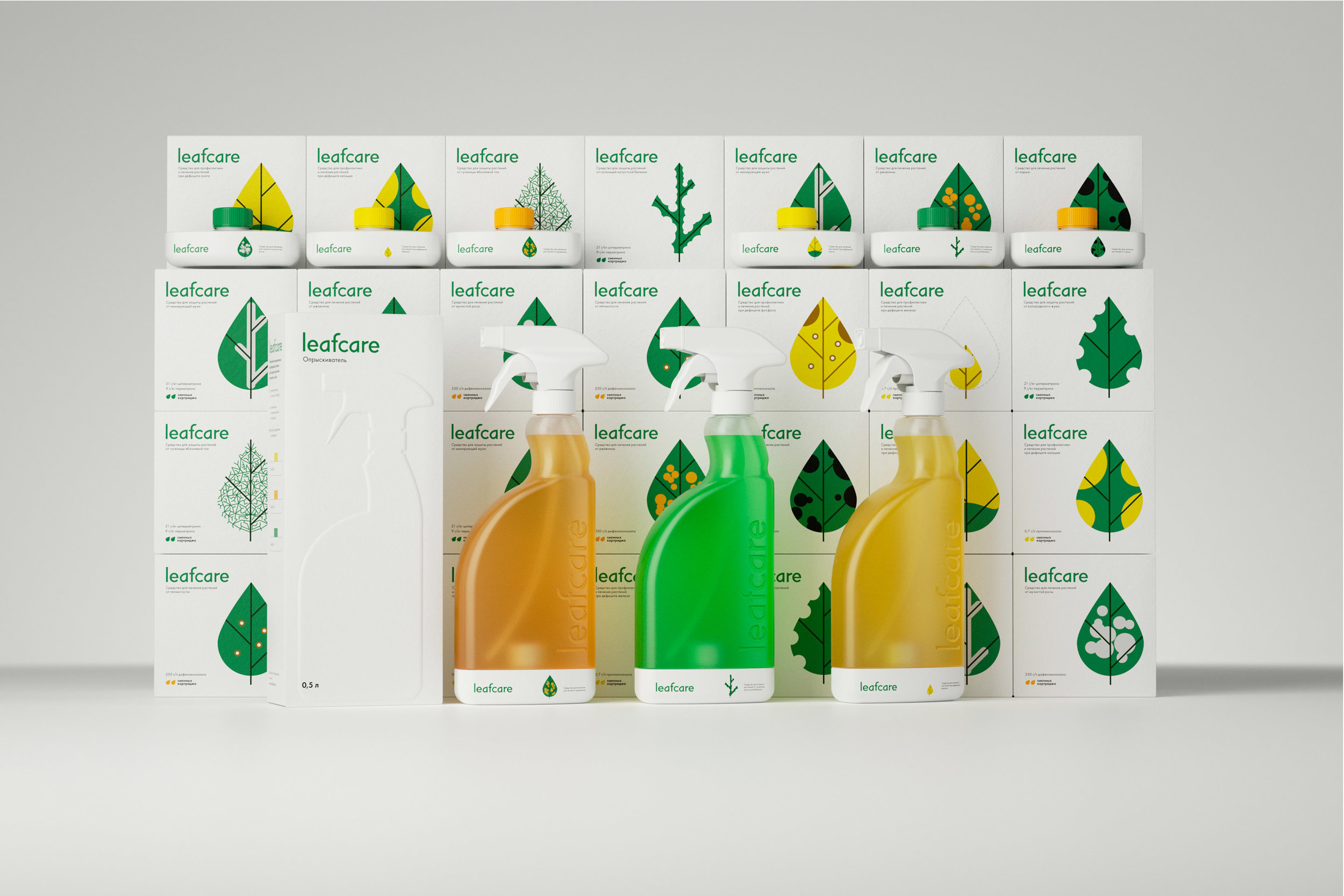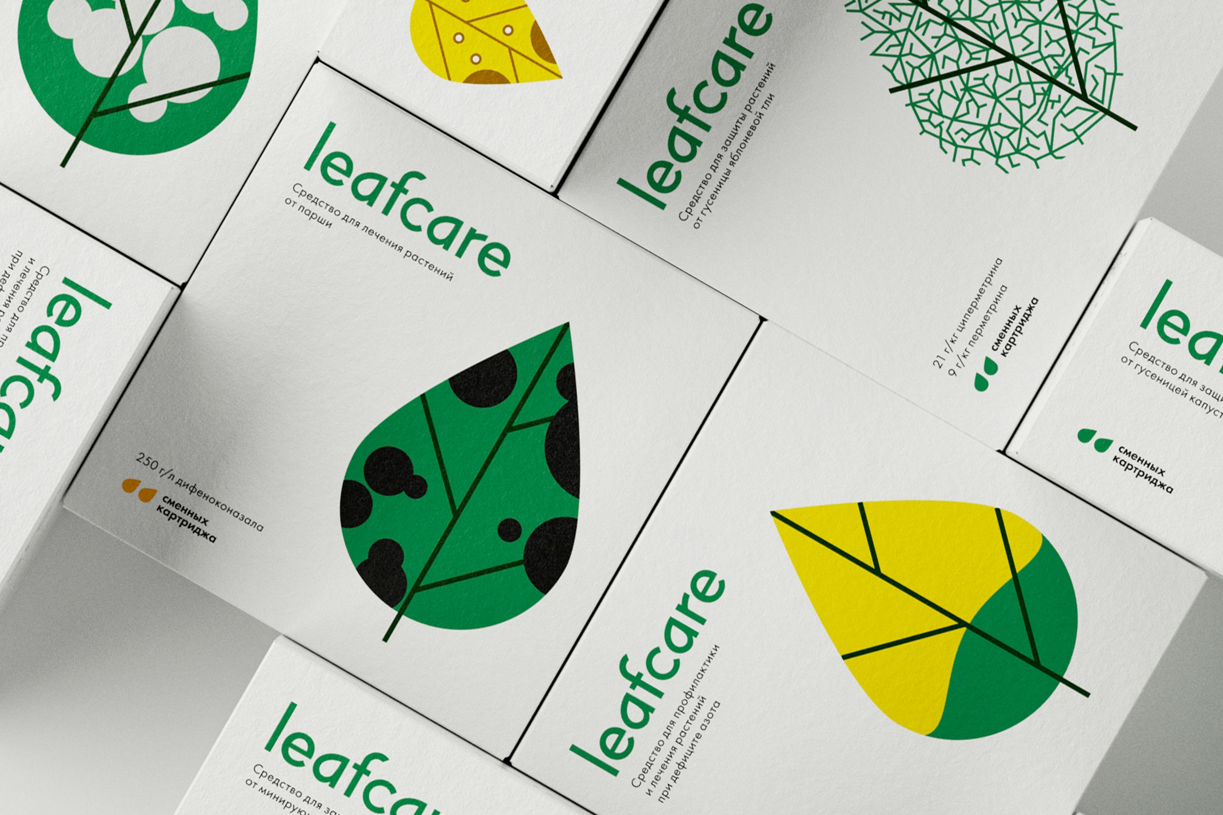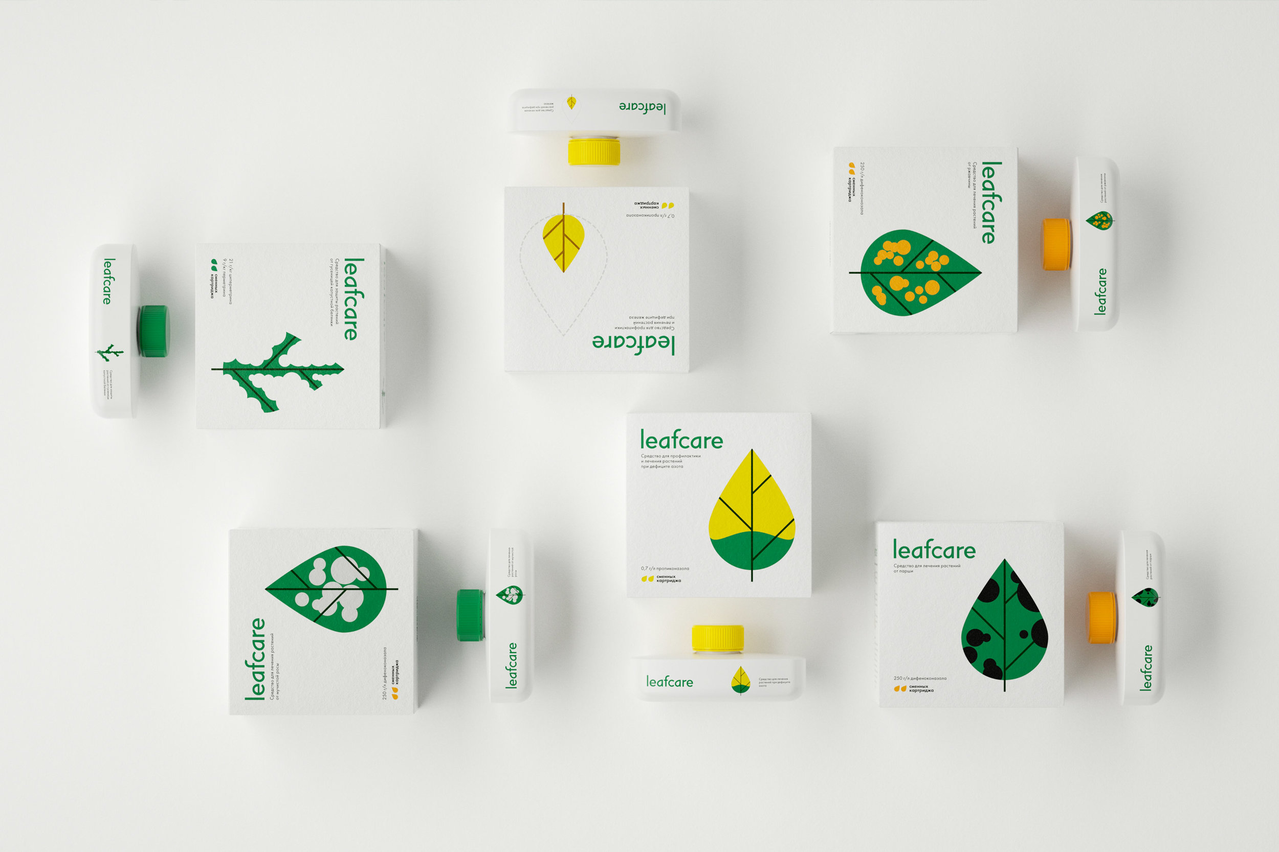 El diseño que creó Alexandra se basa en esta misma conexión entre la enfermedad de la planta y sus consecuencias evidentes en las hojas. El producto de línea incluye tres tipos de protección, que tienen un diseño con código cromático: protección contra insectos (en verde), tratamiento de enfermedades (color naranja) y prevención de enfermedades en caso de falta de sustancias necesarias (color amarillo). Cada tipo consta de cuatro productos, y cada producto tiene su propio identificador único: una hoja con las lesiones específicas. Por lo tanto, con solo mirar la hoja se puede resolver el problema de la planta sin la necesidad de tener conocimientos específicos.