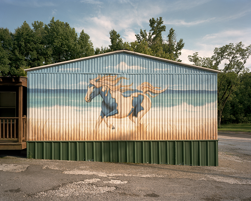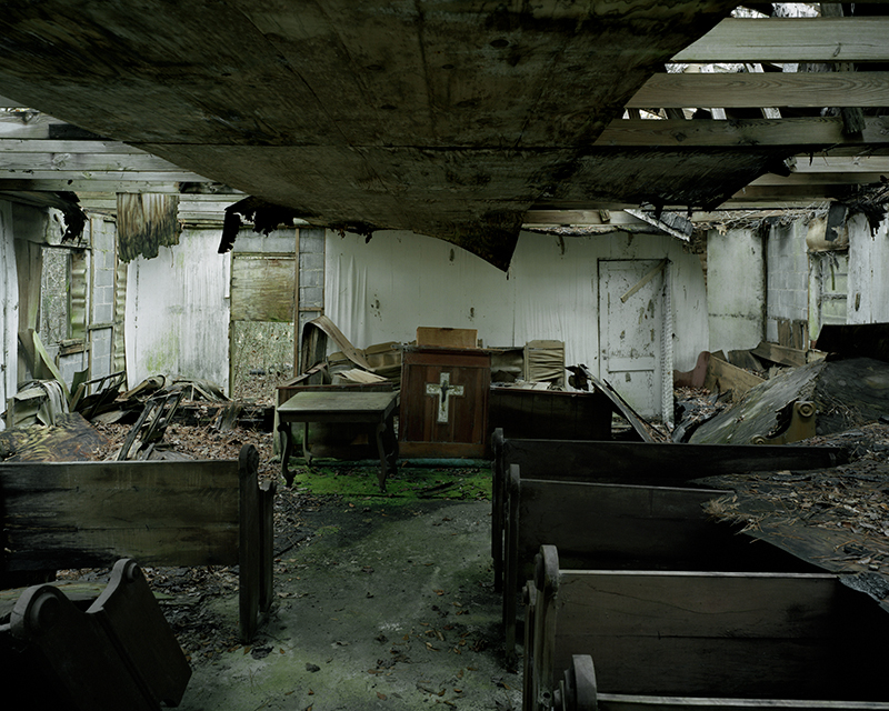 Las experiencias y los recuerdos de la infancia continúan informando mis imágenes, visualizadas por temas recurrentes, como edificios comerciales, carteles, cementerios e iglesias. Siempre he sentido curiosidad por las tiendas y edificios comerciales de ciudades pequeñas y las “historias que podrían contar”. Mi aprecio por la señalización y la tipografía ha aumentado mientras trabajaba en un departamento de arte de la universidad que está centrado en el diseño gráfico. Perder a mis dos abuelos con pocos meses de diferencia fue devastador cuando niño, y esta experiencia estimula la fascinación por los cementerios. Tales paisajes de monumentos y flores simbolizan particularmente el deterioro y el paso del tiempo. Siendo criado en la iglesia, me atraen continuamente las estructuras que son una combinación de todos estos elementos: arquitectura vernácula, publicidad e iconografía, muerte y decadencia y, a veces, revitalización.