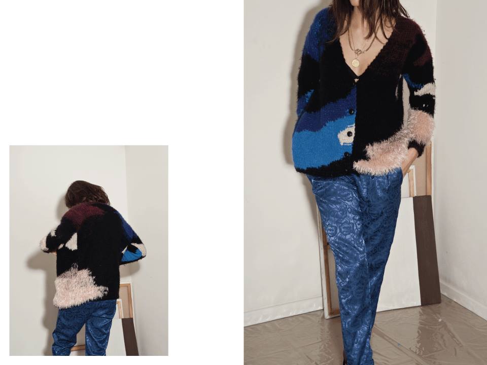 Los vestidos bandeaux con recortes, ícono indiscutido de la casa, siguen presentes y no dan más de lindos. La paleta, bien caliente, se hace fuerte en el colorado y el bordeaux y toma al azul eléctrico y al fucsia como aliados y al negro y beige como soportes para acercarse al objeto neón, bien presente en la obra de la artista. Piezas como el vestido largo de anclas fucsia, el cárdigan de lana manchado en azul, bordeaux y beige, o las botas diseñadas con volutas de fuego son las elegidas por las diseñadoras como las imperdibles de la colección.