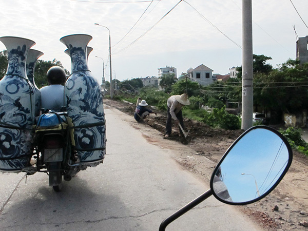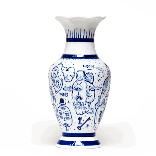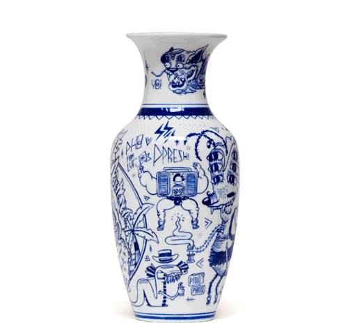Con una onda muy similar a los clásicos jarrones de la dinastía Ming, manteniendo forma y colores, es muy interesante ver cómo los dibujos pueden resignificar completamente la pieza. Para decorar la casa sin lugar a dudas.