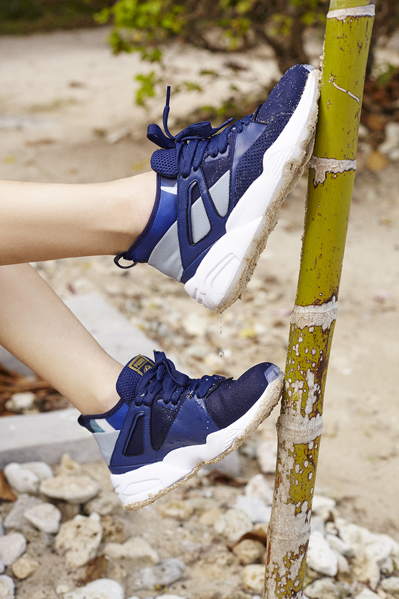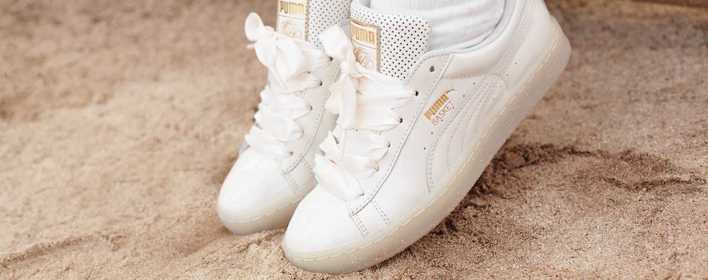 Es así como encontramos a las clásicas Basket confeccionadas en charol blanco, con la opción de cordones o cintas para ajustarlas y el pattern delicado que se corona con la rosa que caracteriza a la artista estampada en dorado en el talón. O por qué no las modernas B.O.G Sock, en gamuza azul eléctrica. Para vestir, cropped tops, camperones estampados y shorts deportivos se llevan todas las flores.