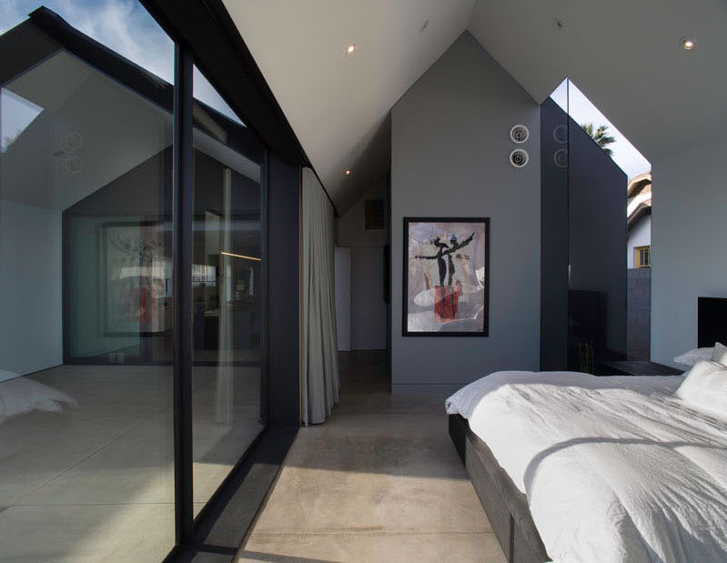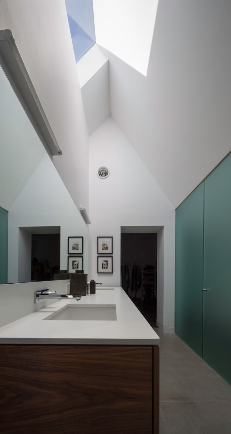 El baño en suite cuenta con una claraboya que hace que el ojo viaje hacia arriba, logrando la ilusión de que la habitación es más grande de lo que parece.
