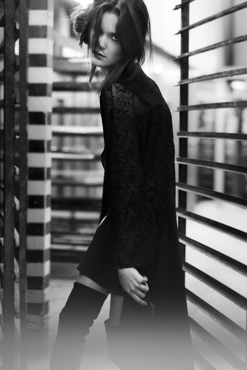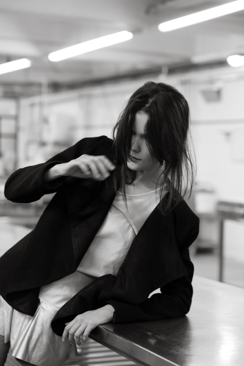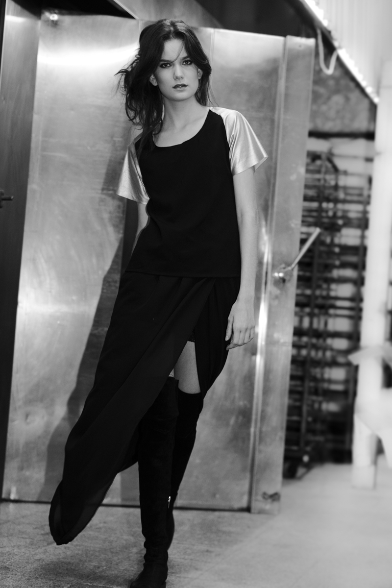Como es de esperarse de una diseñadora que se pone la camiseta y juega a todo o nada por su mas reciente creación, Camila Straschnoy nos recibió en su showroom de Acassusso vestida de pies a cabeza por Rockin’ Flika. Una pollera larga de gasa negra y una remera con mangas metálicas, también negra, nos dan la pauta inicial que nos va a llevar a conocer la totalidad de su mundo.