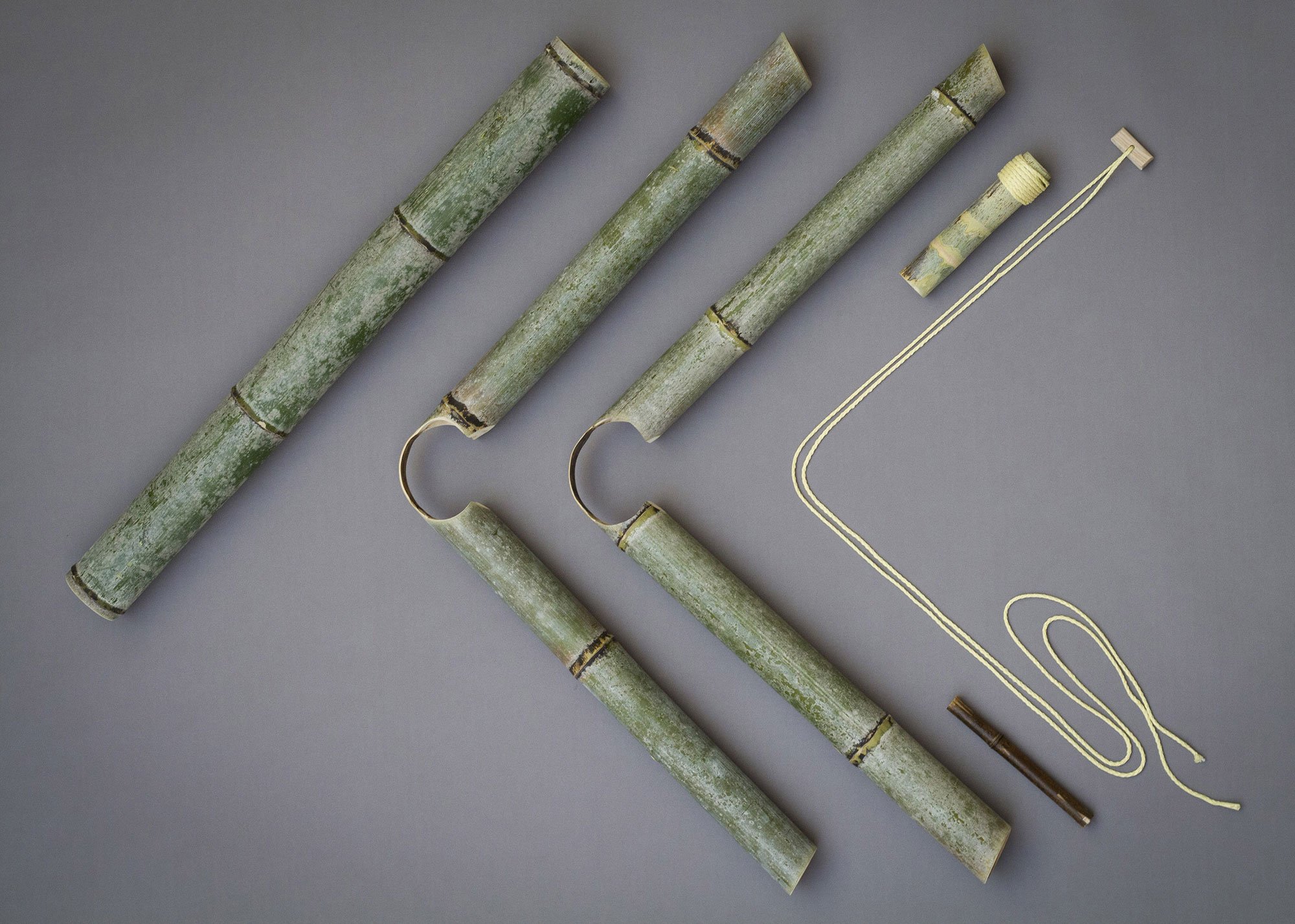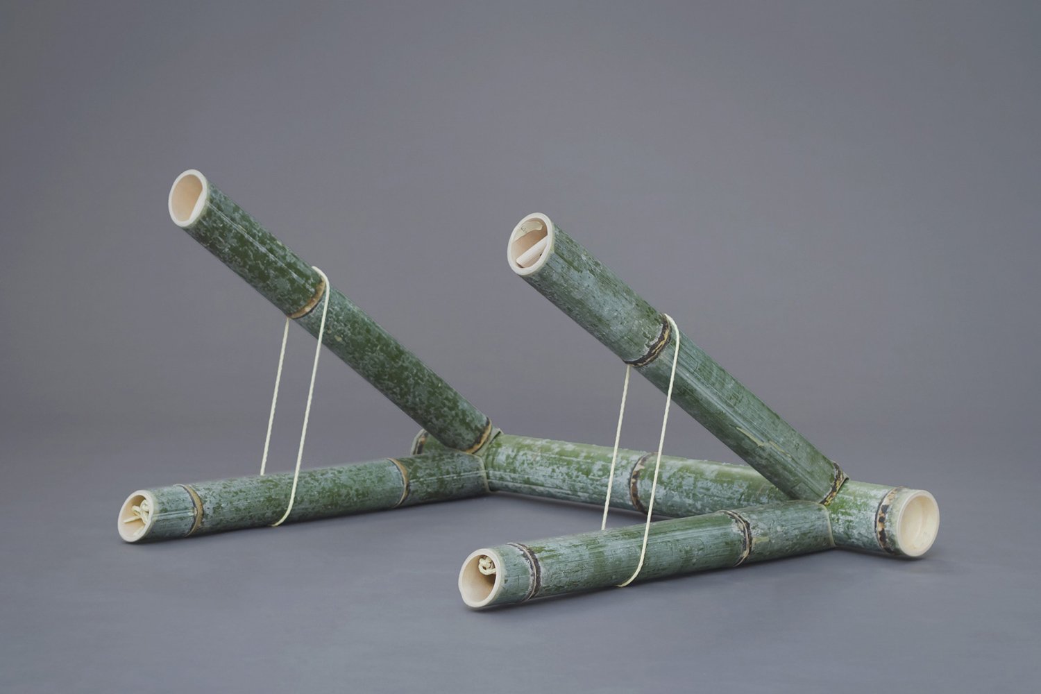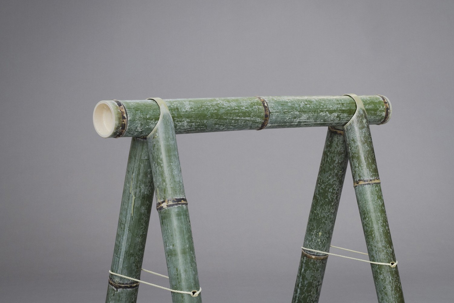 Fácilmente transportados y montados, los caballetes y el banco de mesa Soba están hechos de bastones de bambú no tratados, sujetos por finas cuerdas. Como material, el bambú es ligero, pero robusto, y valioso para muchas generaciones de artesanos japoneses debido a sus razones técnicas y prácticas.