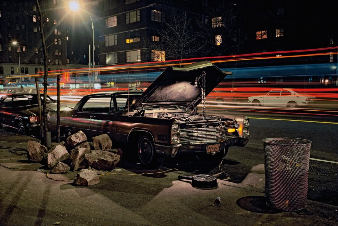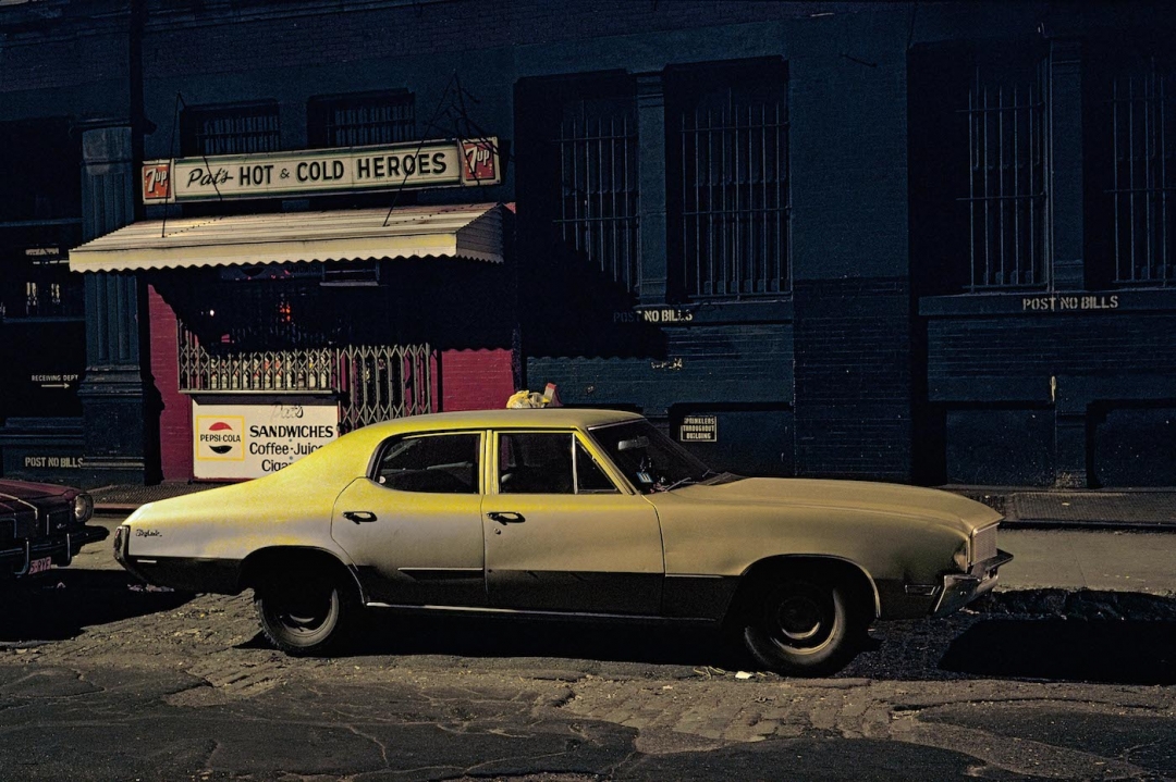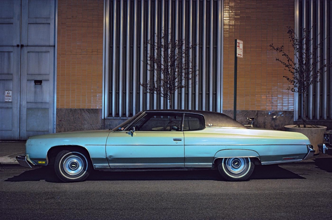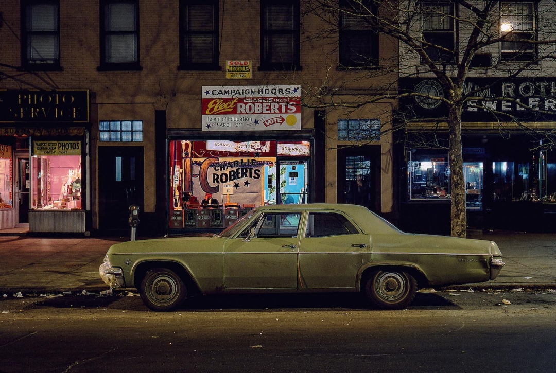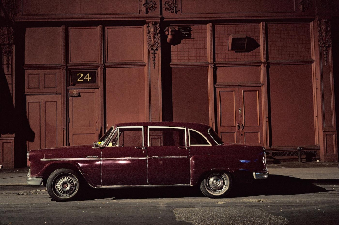 “Un gran trípode, una Leica, un lente de 40mm, una película de Kodachrome y dos años de vagabundeo”, escribió Clay, de Mississippi. “Era la fotografía de la calle misma. Un coche. Un fondo. Tan sencillo. La noche se convirtió en su propio color”.