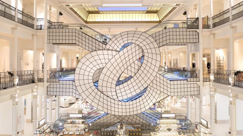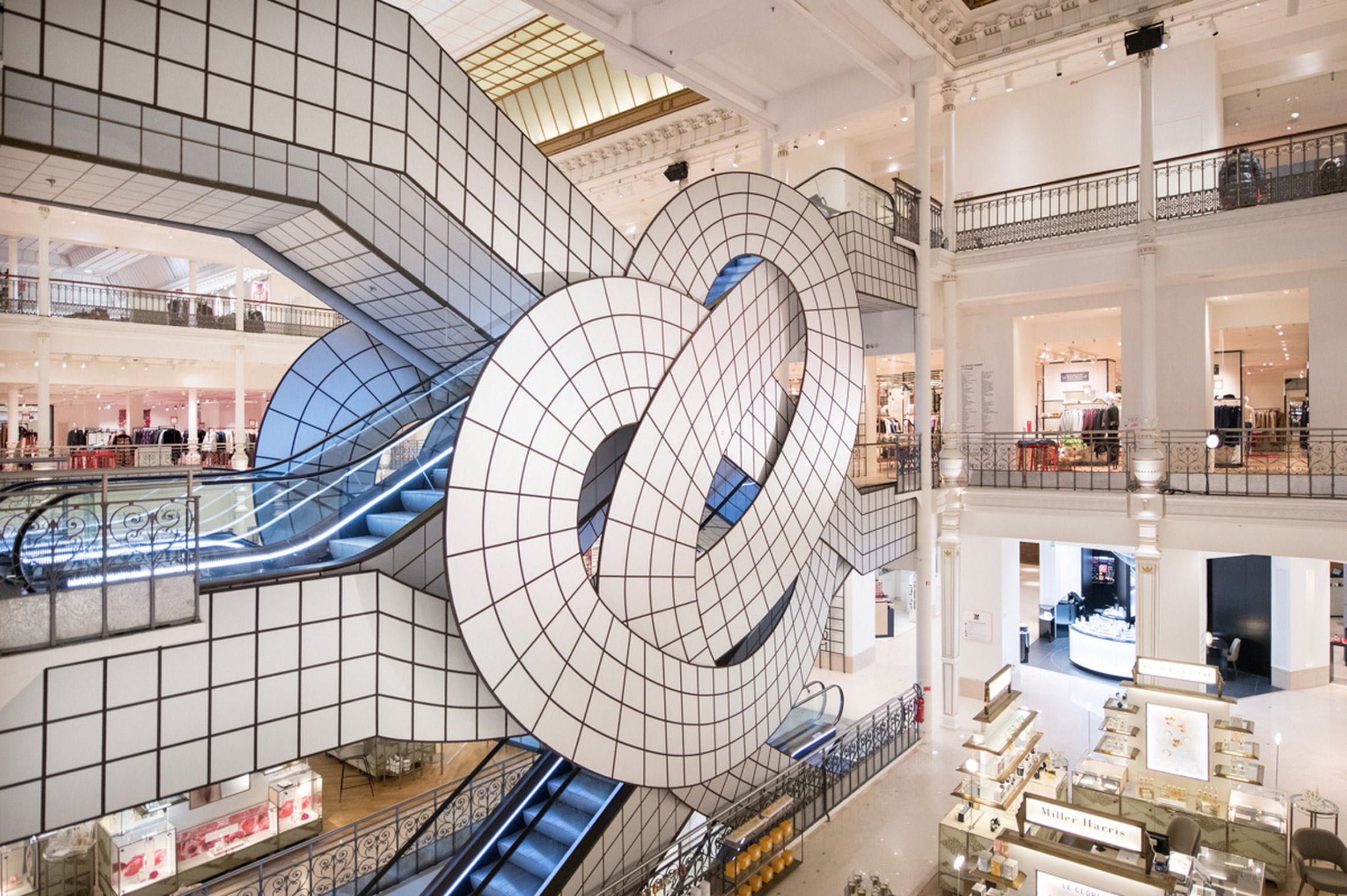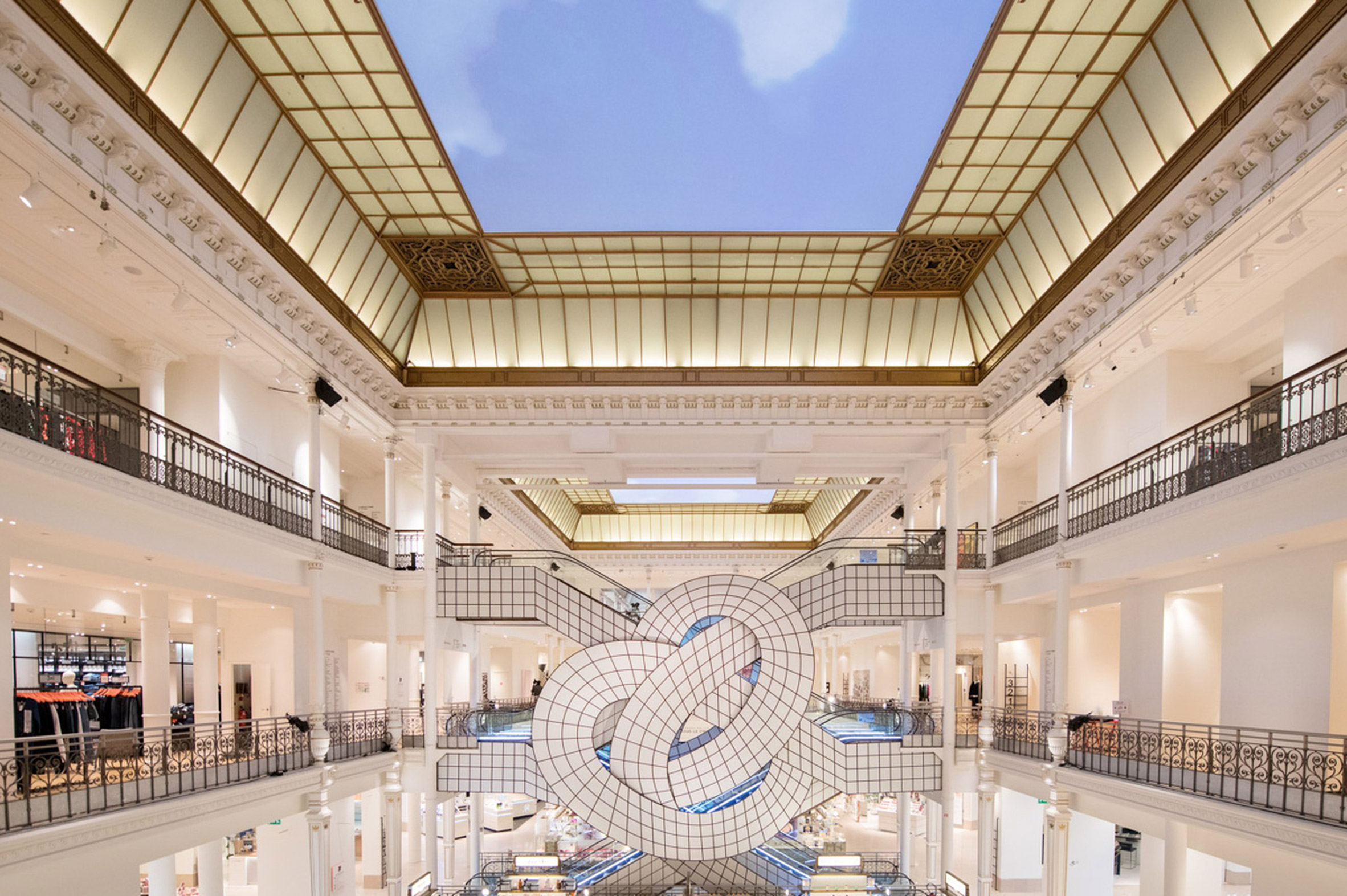 Para rendir homenaje a los cielos cambiantes de la Ciudad Luz, el artista llenó las ventanas del edificio con formas de nubes, que se complementa con una proyección en una pantalla gigante que se instaló bajo el techo de vidrio de la tienda. La pieza clave y que todos están destacando es el nudo que conecta las tres escaleras mecánicas engañando al ojo a creer que, al subir, los visitantes recorrerán en su trayecto una suerte de montaña rusa.