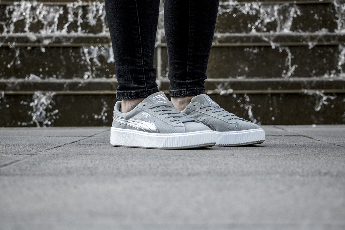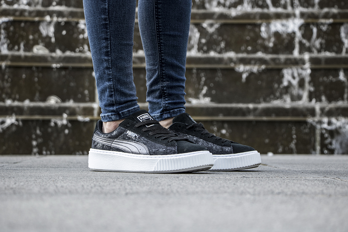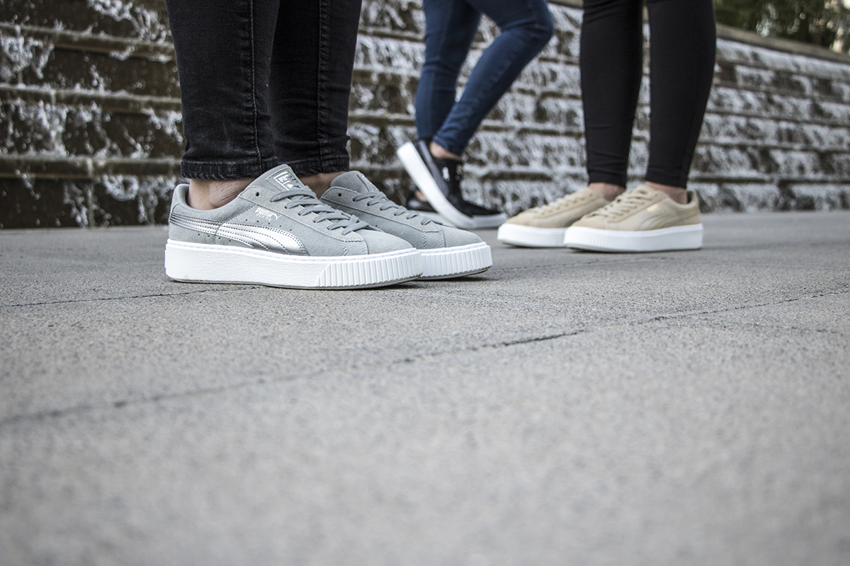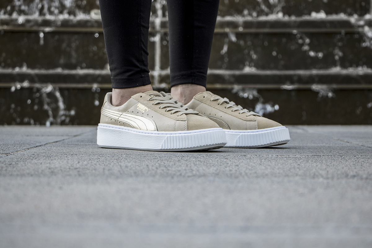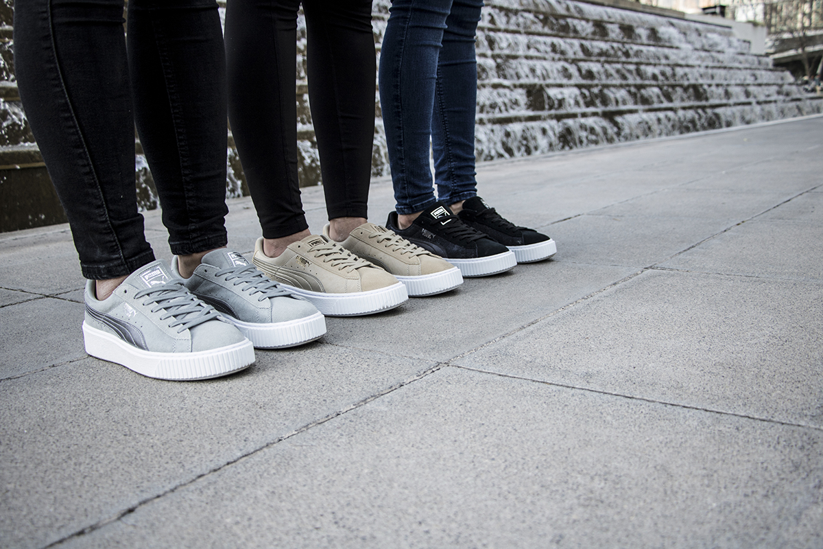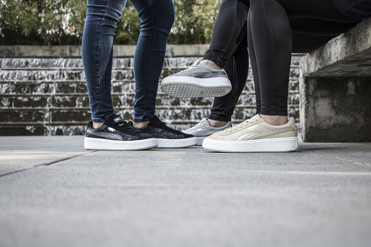 Disponibles en tres gamas de colores – beige “Safari,” gris metálico y el clásico “PUMA Black”- estas zapatillas low-top vienen con una capellada en gamuza premium y cuentan con un exterior de detalles en cuero metalizado, tobillo y lengüeta acolchados para mayor comodidad y la característica suela de plataforma de goma. El toque final es la banda de la marca acompañando en el mismo tono sobre el lateral.