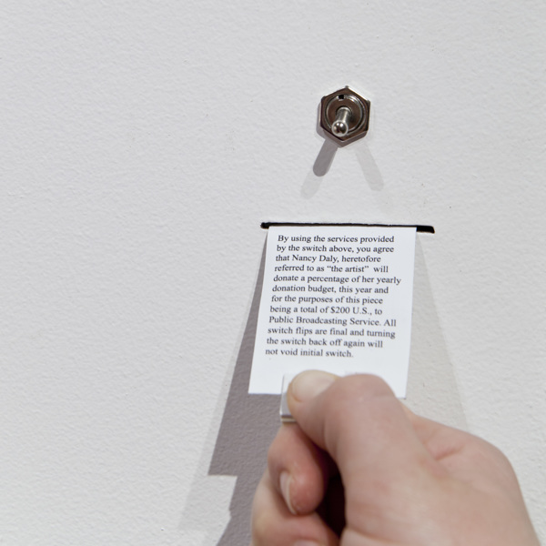 Son 50 lámparas conectadas a 50 interruptores que se activan por una única vez, cada uno conectado a una entidad de beneficencia diferente. Los espectadores eligen qué lámpara encender con una decisión meramente estética y, por debajo del interruptor, reciben un papel que les informa a qué obra fue que donaron los 4 dólares que la artista destina por switch a las entidades predeterminadas.