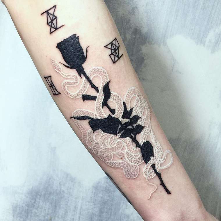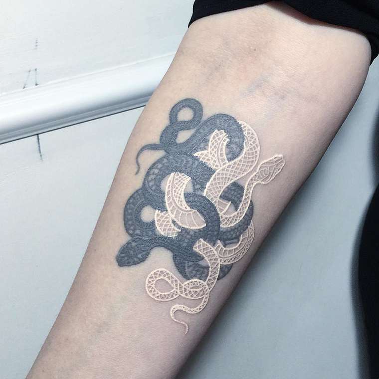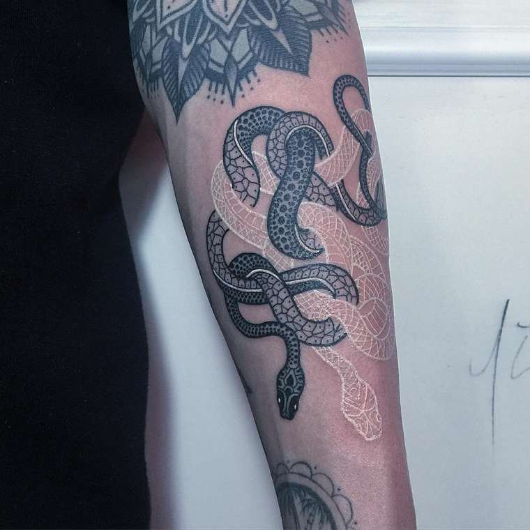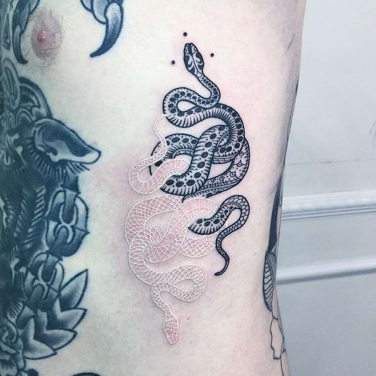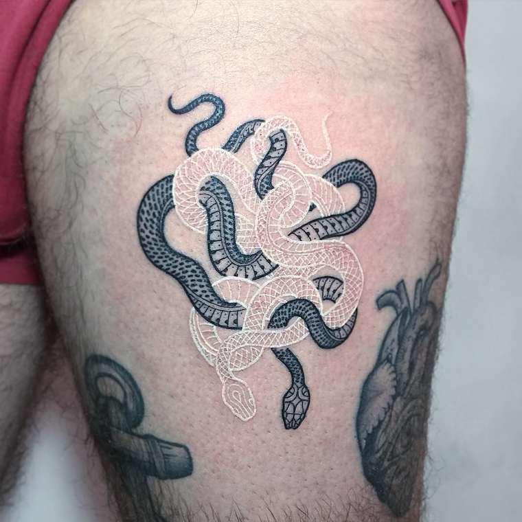 Mirko Sata es un tatuado italiano basado en Milán, que con un excelente manejo de líneas enreda serpientes usando tintas oscuras en contraposición con blancas, logrando un resultado único.