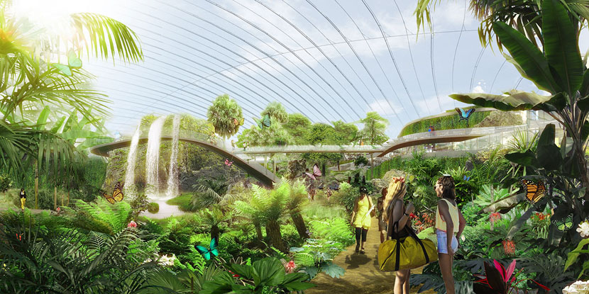 Este lugar único contendrá una gran variedad de fauna y flora, mariposas, flores exóticas, colibríes, cascadas, cuencas de acuarios, peces, tortugas, caimanes y más. Más allá del mundo interior eminentemente exótico, la sensación de inmersión total es posible con el enfoque arquitectónico innovador.