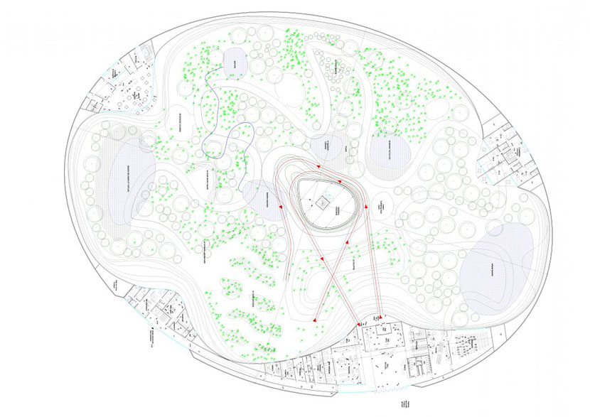 La ausencia de columnas de carga que interrumpan la vista o introduzcan artificialidad, junto con el tratamiento natural de la pared vegetal perimetral que permite solo una vista hacia el cielo desde el interior, los visitantes tendrán la sensación de un espacio desconectado del mundo exterior.