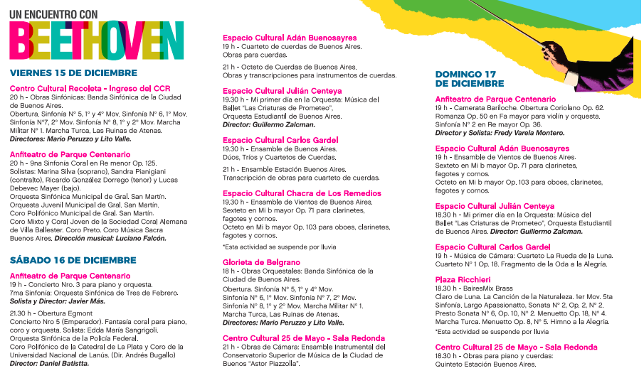 “Conmemoramos el 190 aniversario del fallecimiento de Ludwig van Beethoven, facilitando un encuentro con su obra. Sus maravillosas composiciones van a vibrar en distintos puntos de la Ciudad durante estos tres días. El público no solo podrá disfrutar de los conciertos, sino también dialogar con los músicos, y muchas familias tendrán, seguramente, su primer acercamiento a estas formaciones con ‘Mi primer día en la orquesta'”, aseguró Ángel Mahler, Ministro de Cultura de la Ciudad.