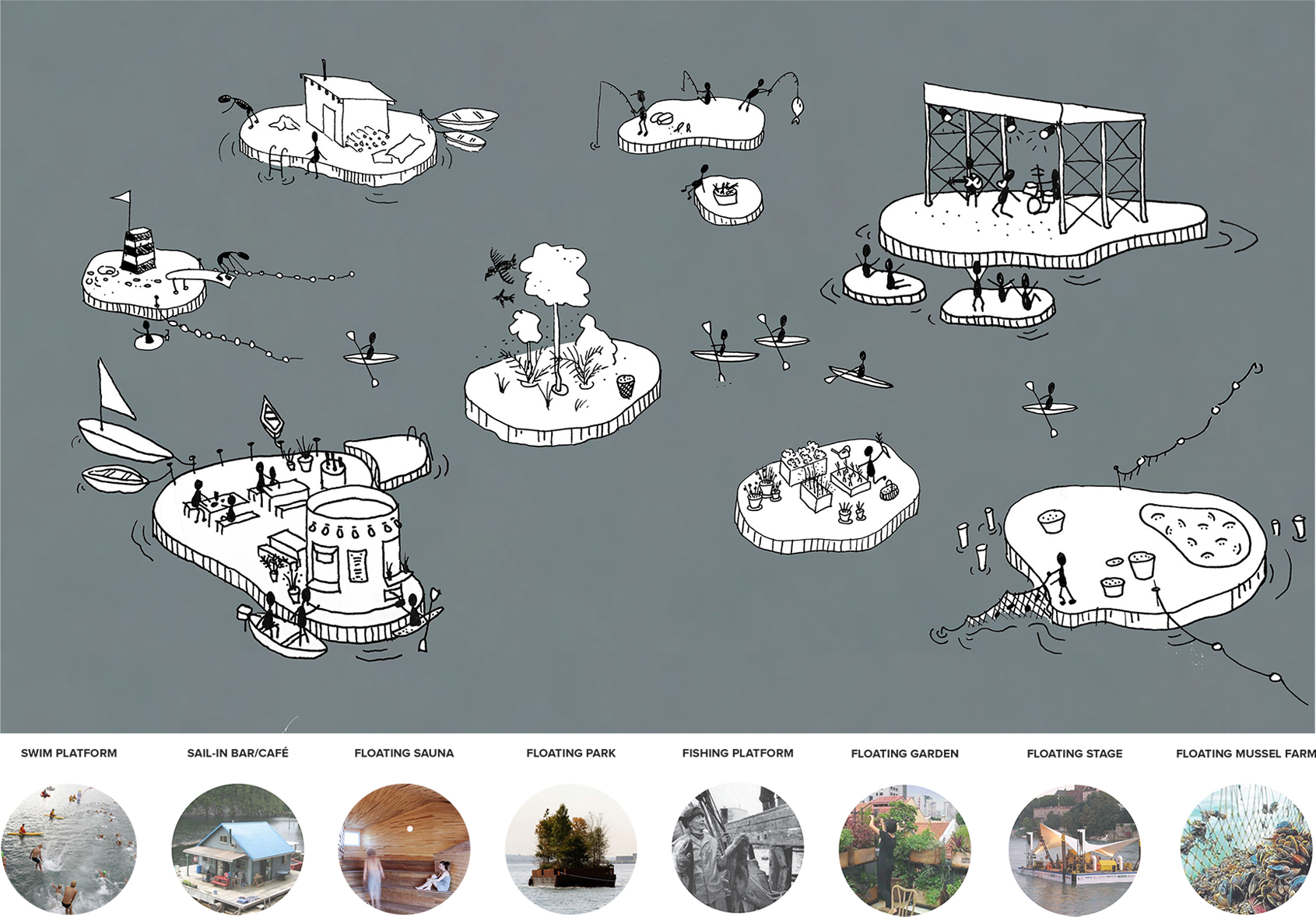 El equipo de diseño está desarrollando un anteproyecto para un archipiélago de islas flotantes similares que se puedan dispersar por el puerto, como una isla Sauna flotante, con jardines flotantes, granjas de mejillones y una plataforma de buceo, con la posibilidad de unirse para crear una gran plataforma si fuera necesario.