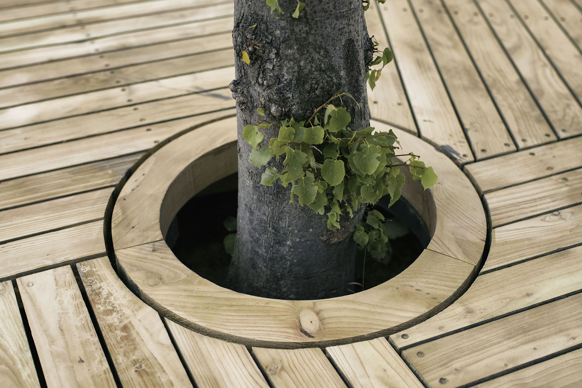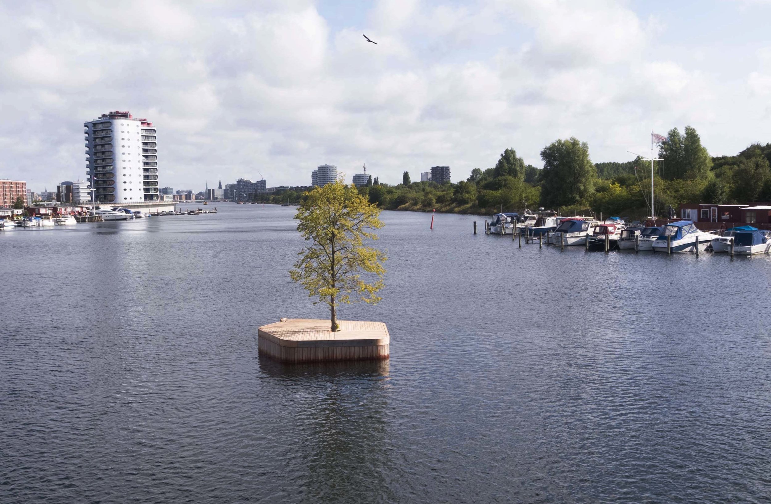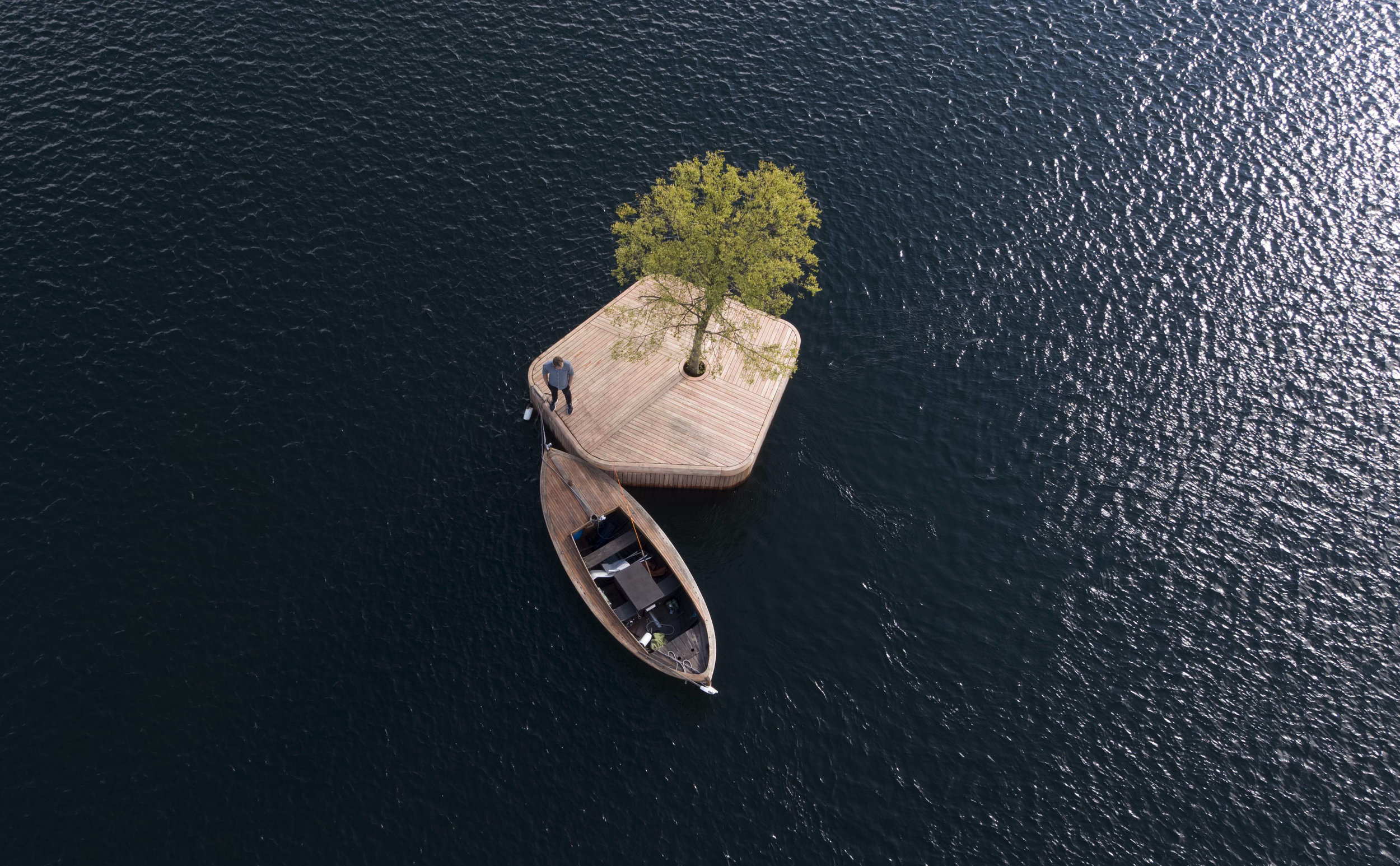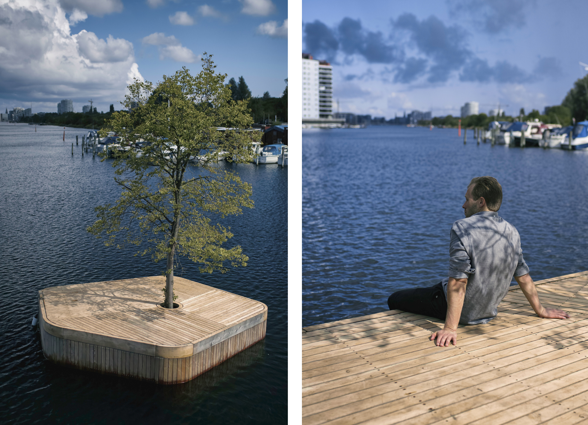 Es una pequeña plataforma de madera hecha a mano de 20 metros cuadrados que está construida completamente en materiales sustentables, productos locales y reciclados, con una base flotante hecha en botellas de plástico recicladas reciclados que albergan un árbol de tilo de 6 metros de altura en su centro.