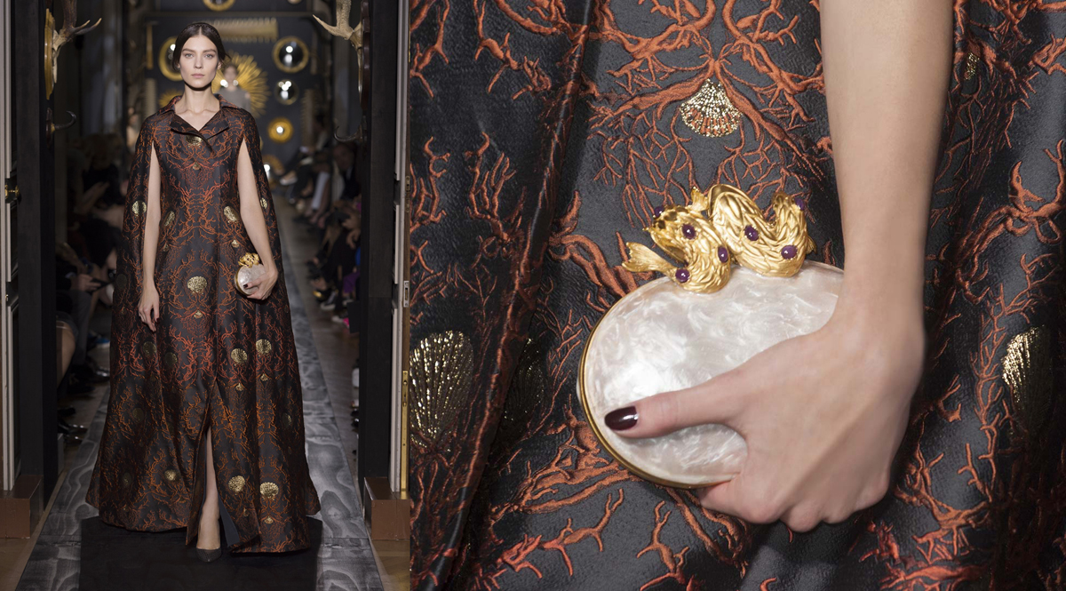 Y a pesar de que la colección arranca con estampas gráficas con animales ilustrados con estilo renacentista, a medida que avanza la colección se van presentando bordados y motivos inspirados en el océano que, aunque funcionan a la perfección recargando vestidos cuando se asemejan a un arrecife de coral, resultan extraños cuando se vuelven figurativos como caracoles en vestidos de fiesta.