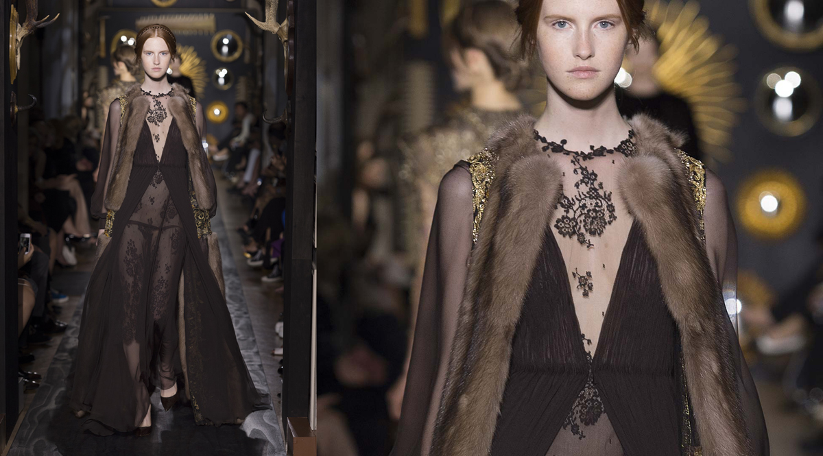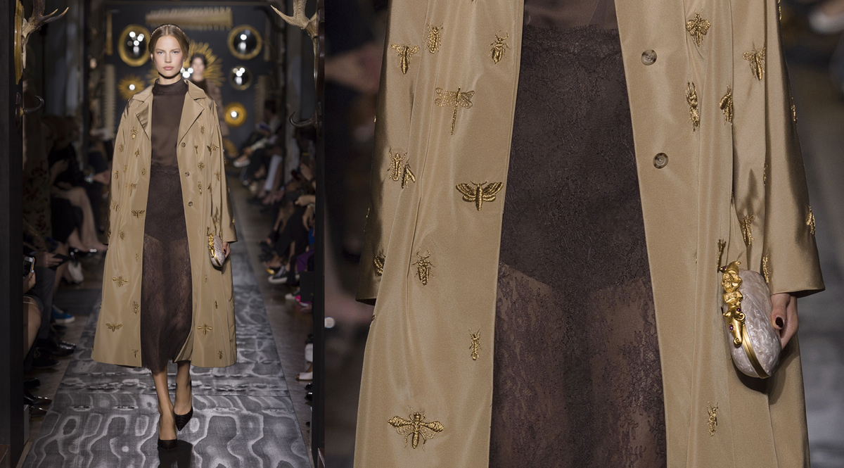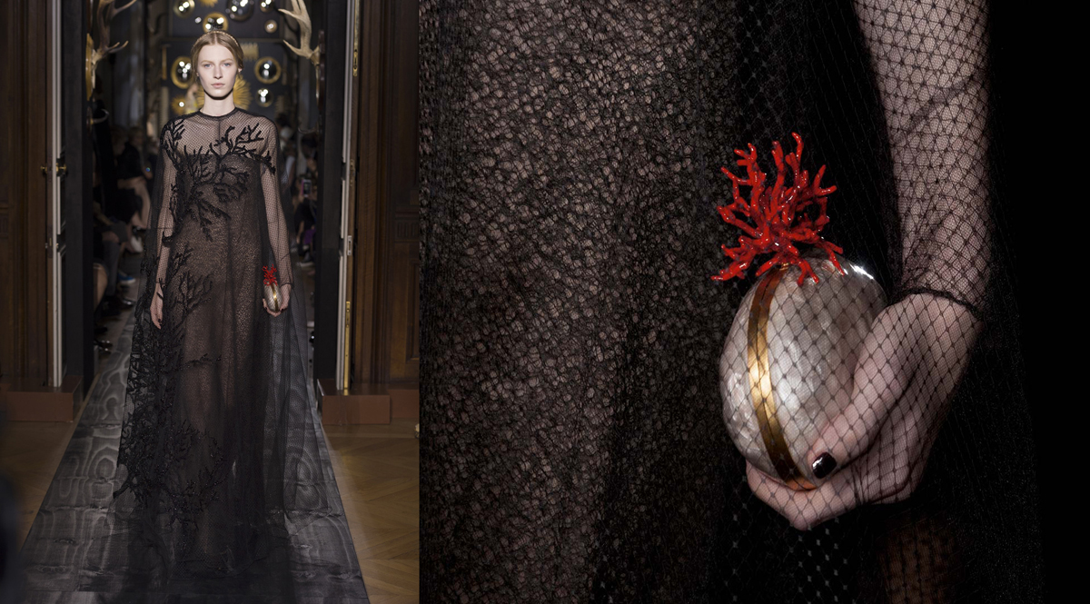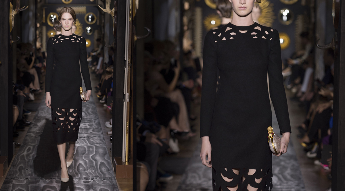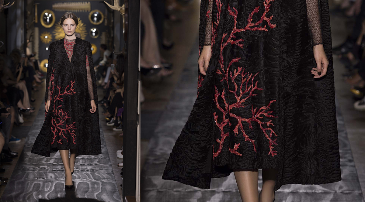 En en los detalles donde ésta y todas las colecciones de Valentino se hacen más fuertes. Porque, a simple vista, puede que un vestido de manga larga negro quede en eso, pero es en la precisión de los cortes del láser sobre el astrakhan, con 500 horas de trabajo de bordado con cristales donde se marca la diferencia. O será tal vez un vestido con cola, que parte desde los hombros con más de dos mil perlas e hilo de oro.