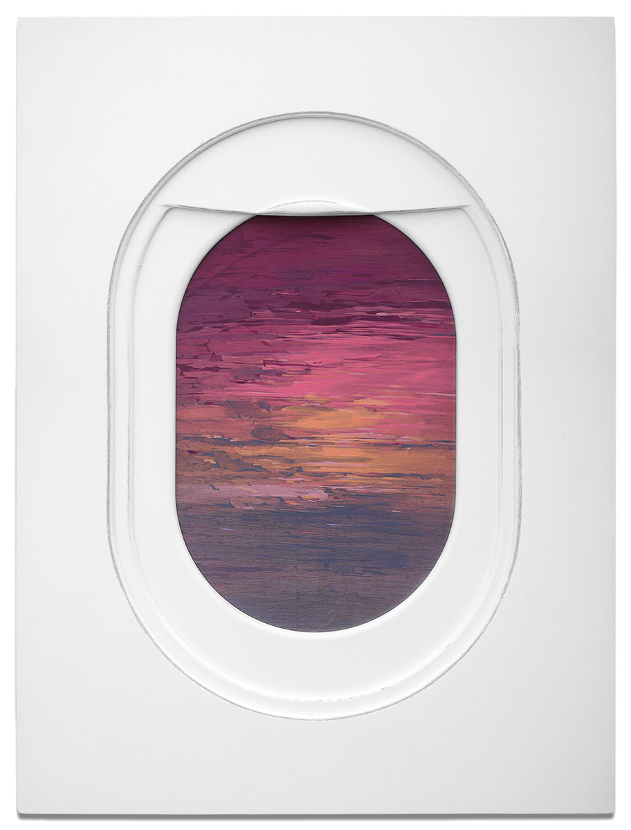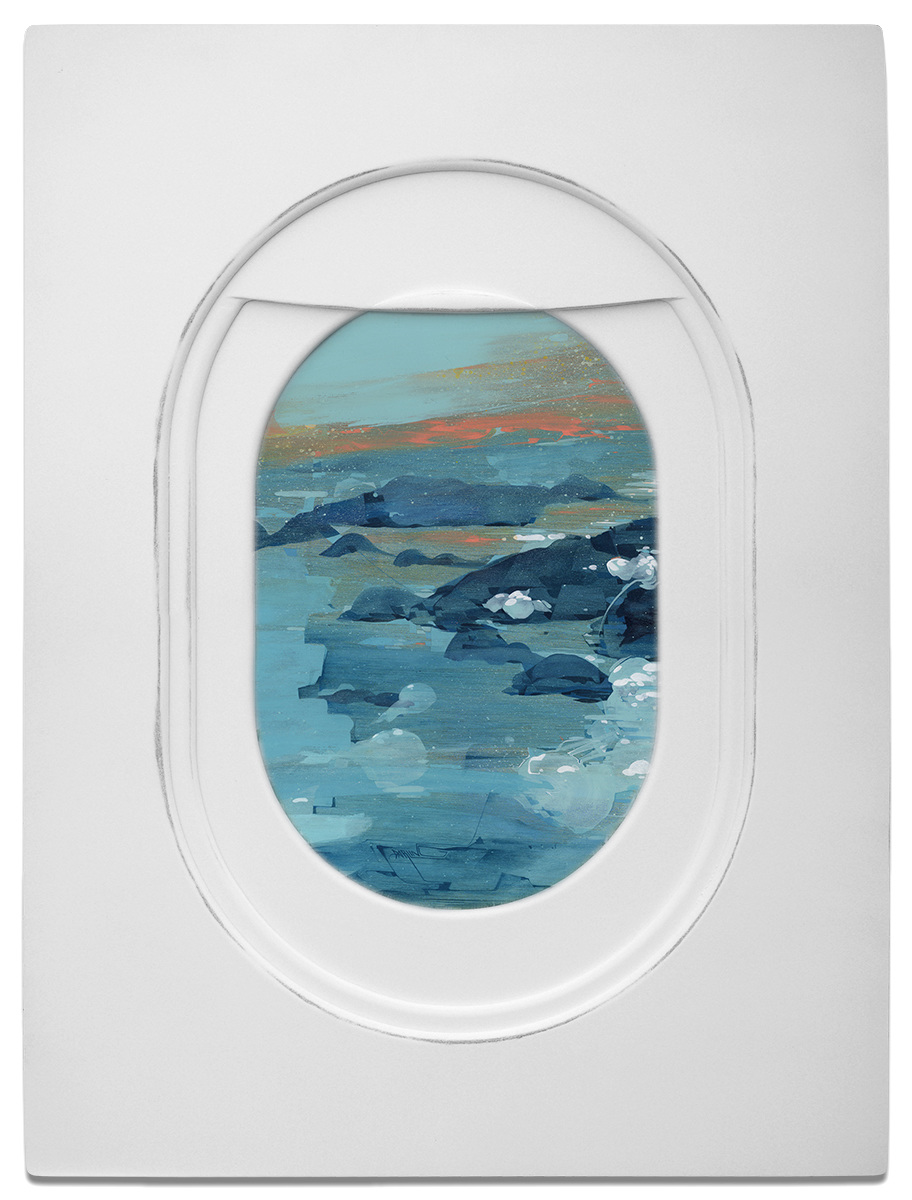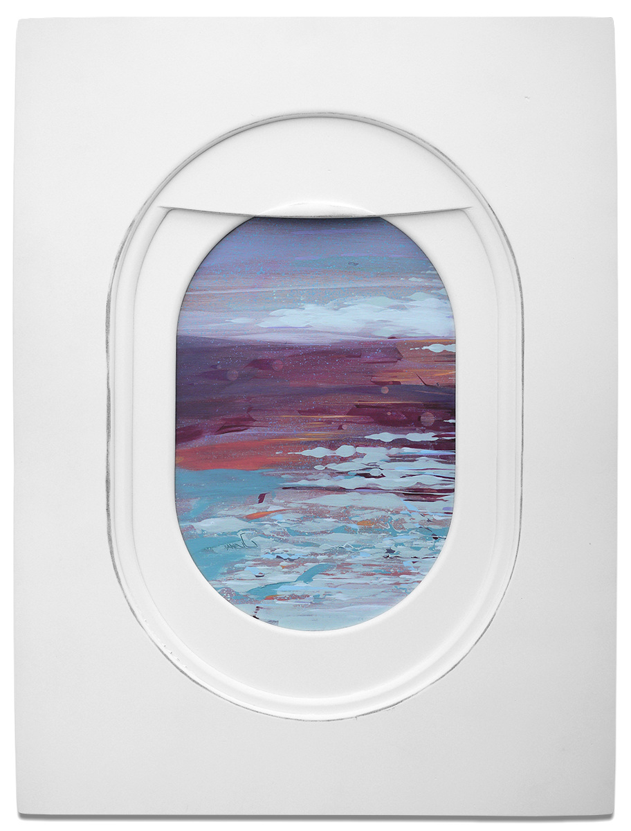 Jim Darling es un artista norteamericano qué aprovechó muchos viajes en avión y ha creado esta serie de pinturas en las que utiliza a las ventanas como marcos y recrea los paisajes que ven sus ojos.