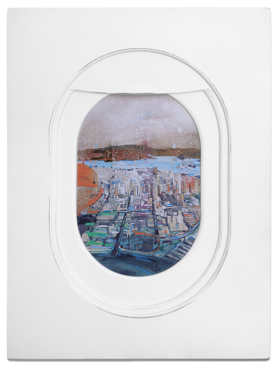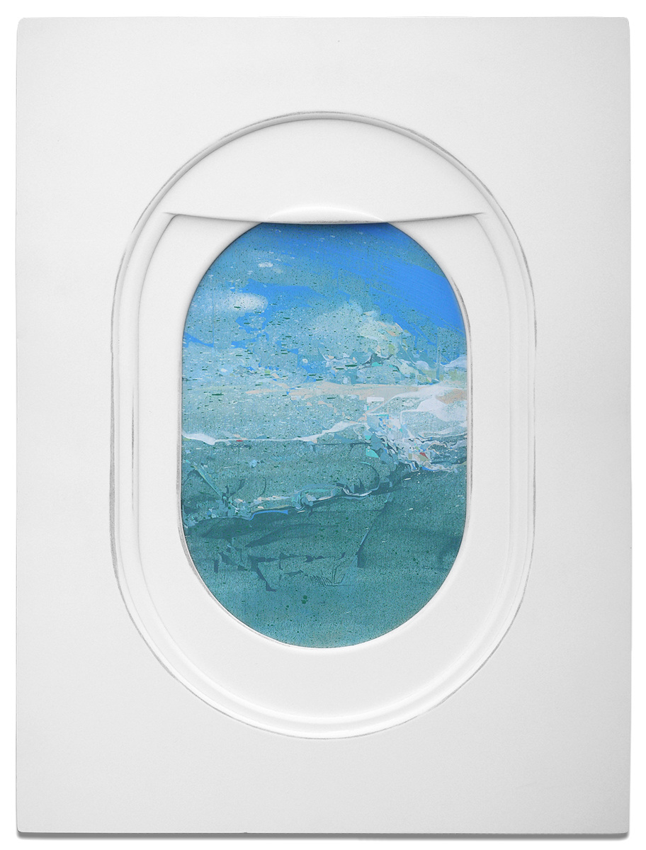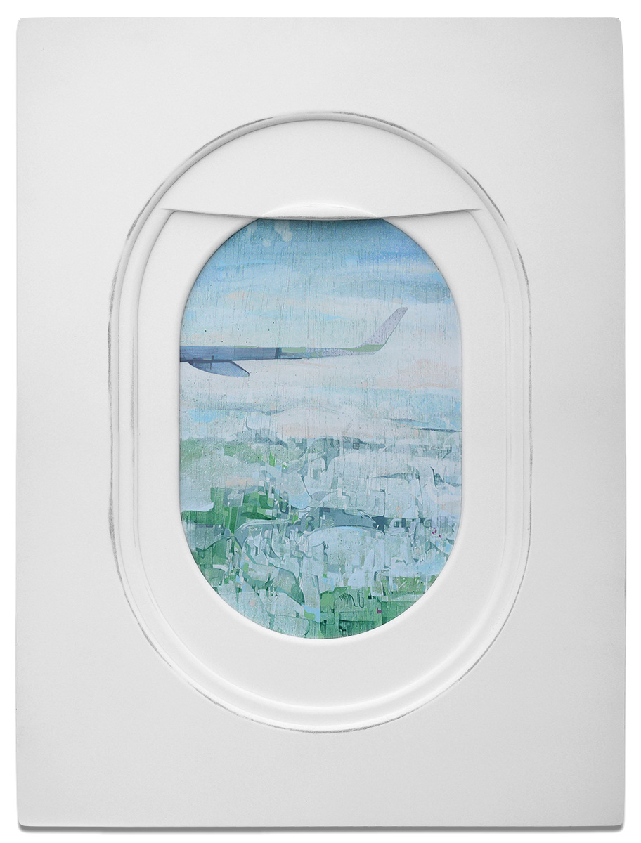 Jim Darling es un artista norteamericano qué aprovechó muchos viajes en avión y ha creado esta serie de pinturas en las que utiliza a las ventanas como marcos y recrea los paisajes que ven sus ojos.