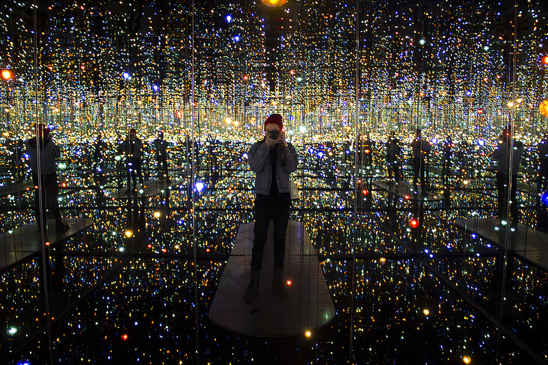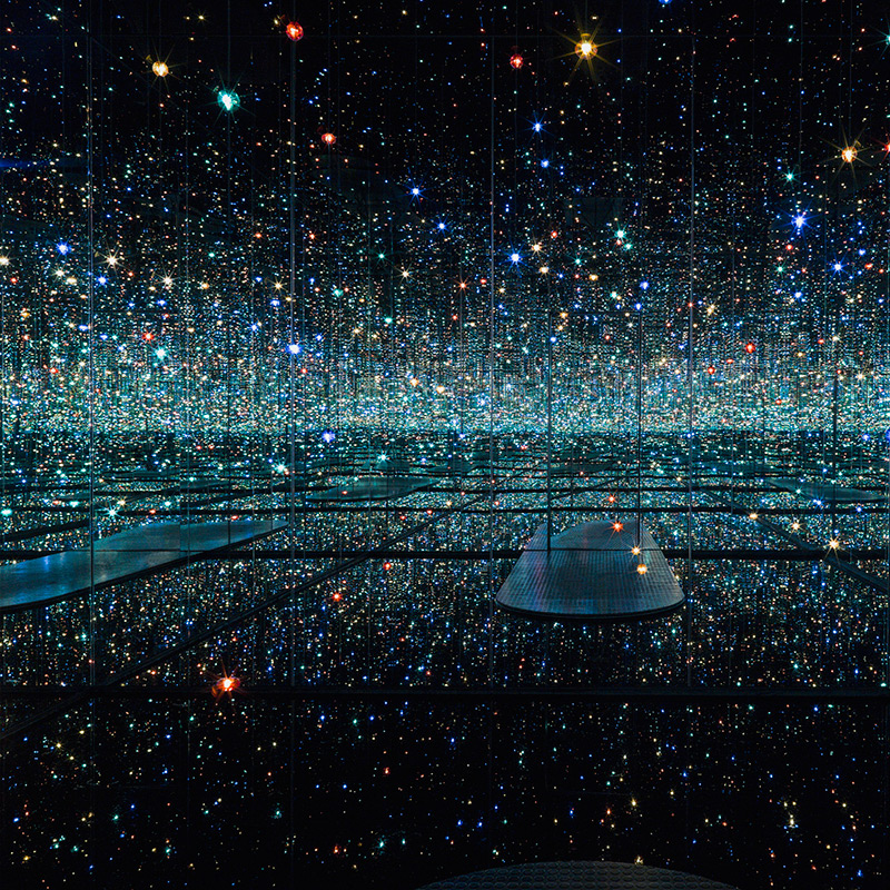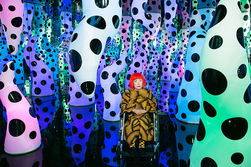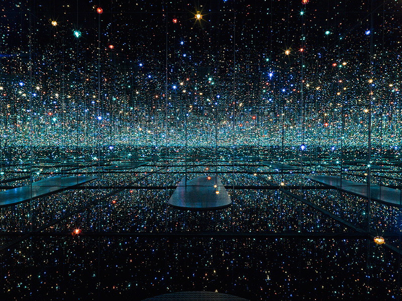 La artista está mostrando 27 pinturas a enormes y 2 de sus famosos “Infinity Rooms“.